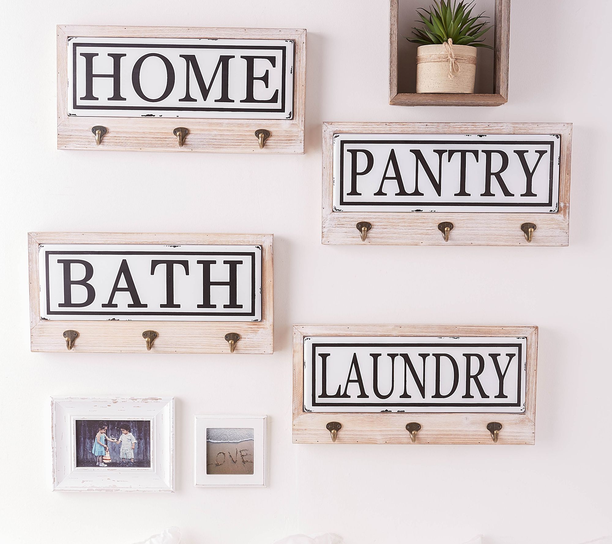 Wet towels have found a new home on the hooks of this farmhouse-chic bath sign. Fluffy robes are welcome, too!