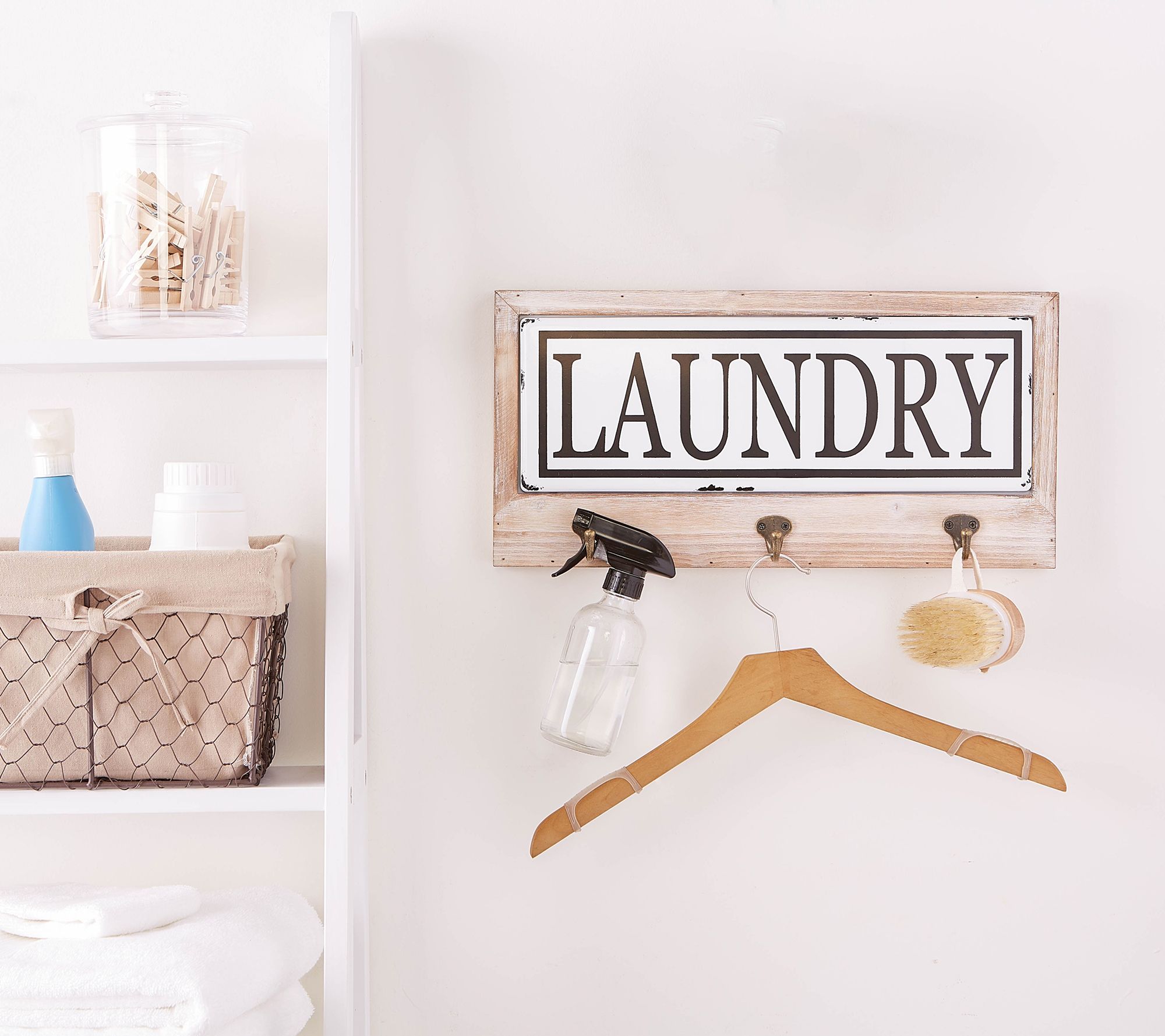Let your line items hang dry on the hooks of this farmhouse-chic laundry sign. Great for kids backpacks, keys, and jackets, too!