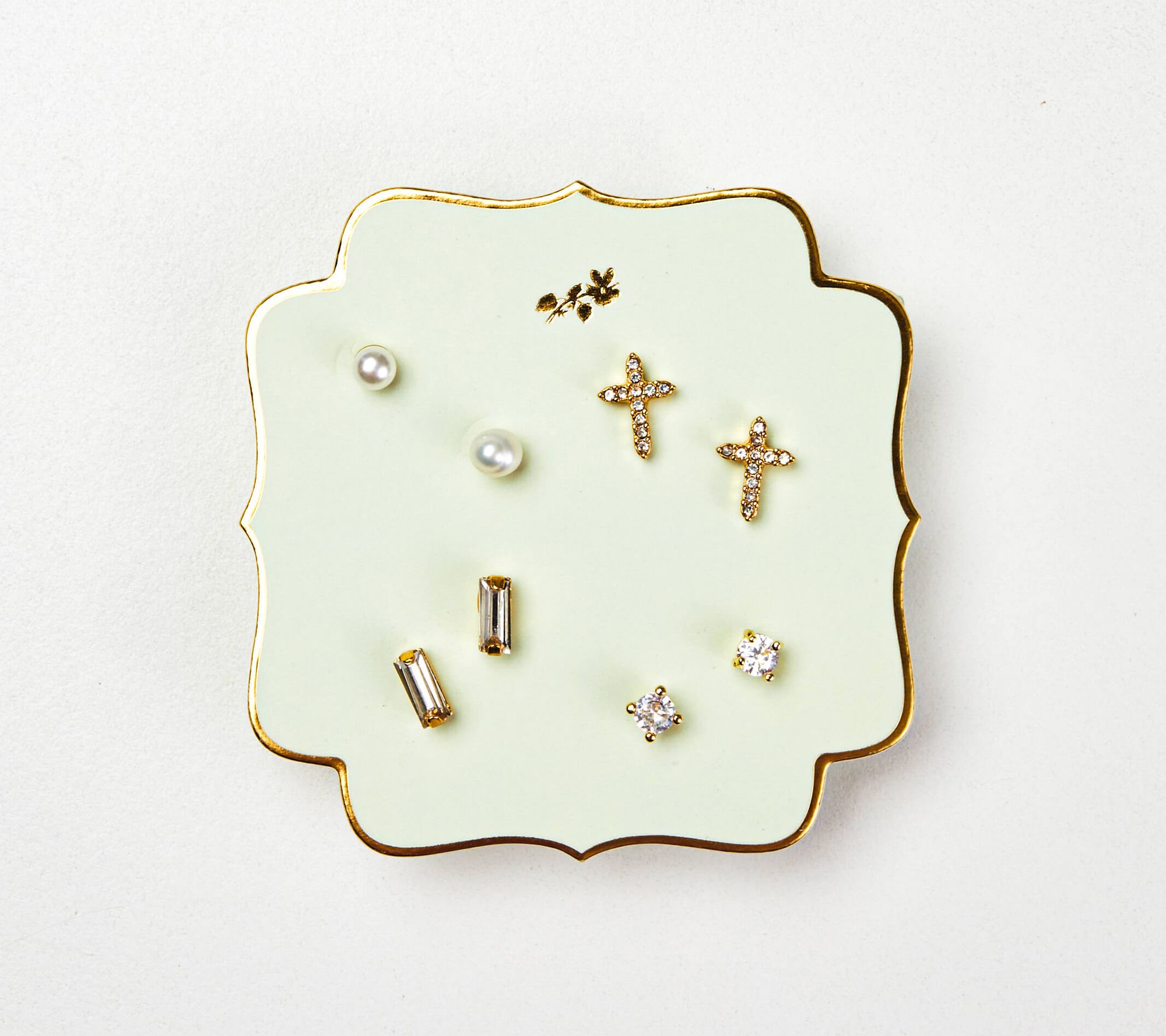 • Measures approximately: Cross 3/8"L x 1/4"W; Baguette 1/4"L x 1/8"W; Pearl and round stud 1/8"L x 1/8"W