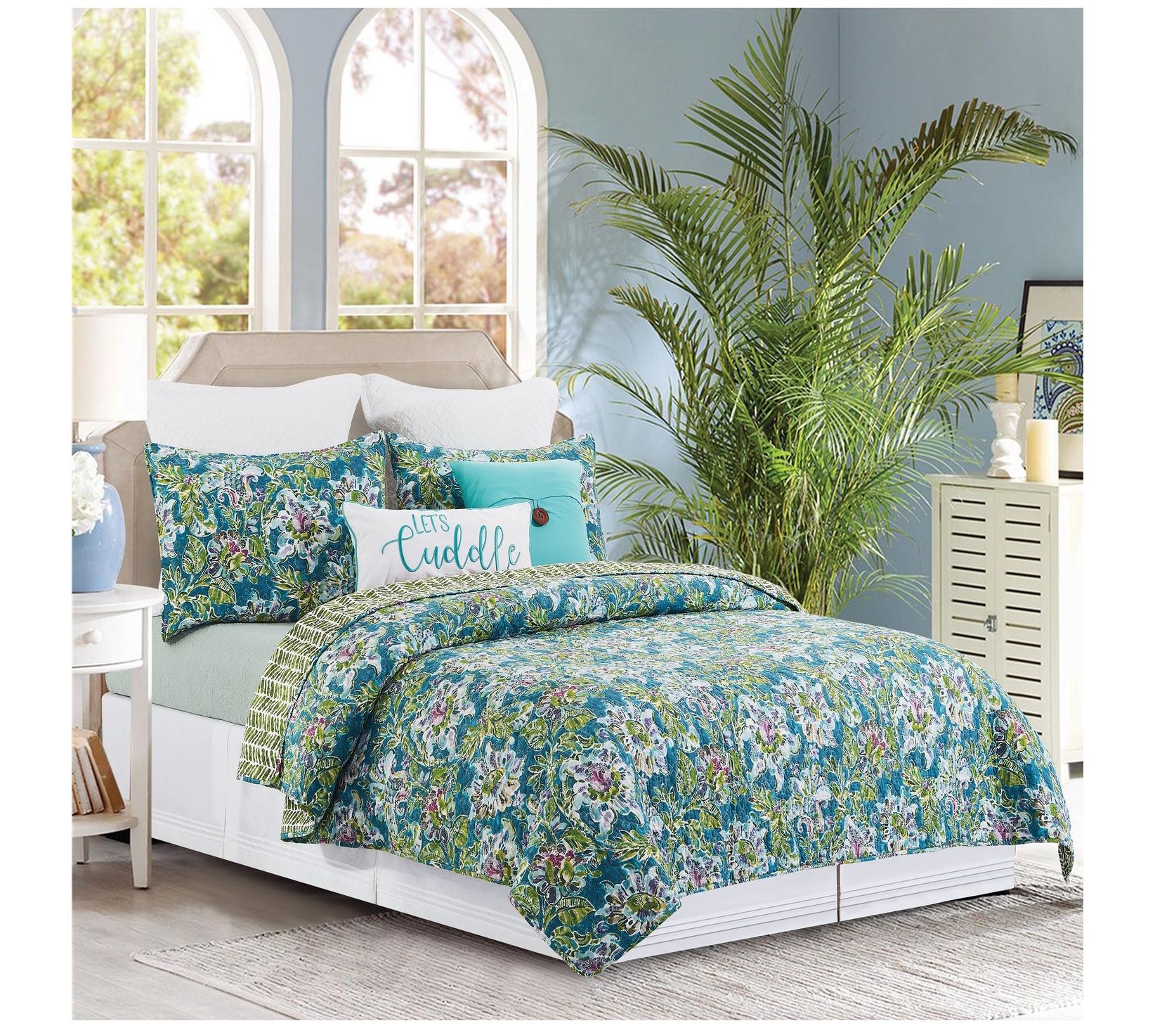 Transform your bedroom into a tropical paradise with this vibrant, garden-themed quilt set by Valerie. The reversible design features dreamy shades of violet, purple, blue, and green, offering two versatile looks to suit your style. The set is machine washable for easy care, bringing both beauty and convenience to your space. From the Valerie Parr Hill Collection.