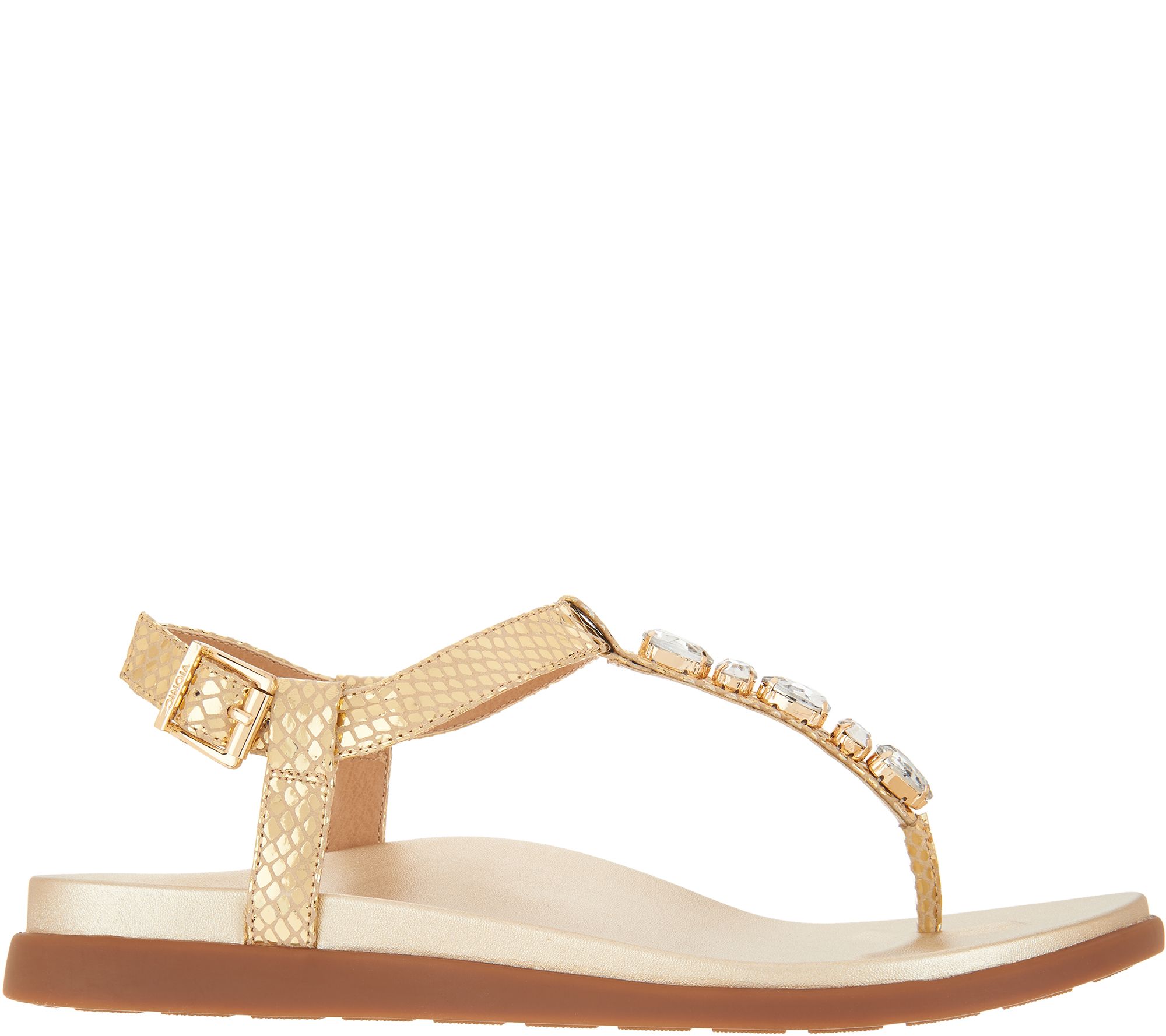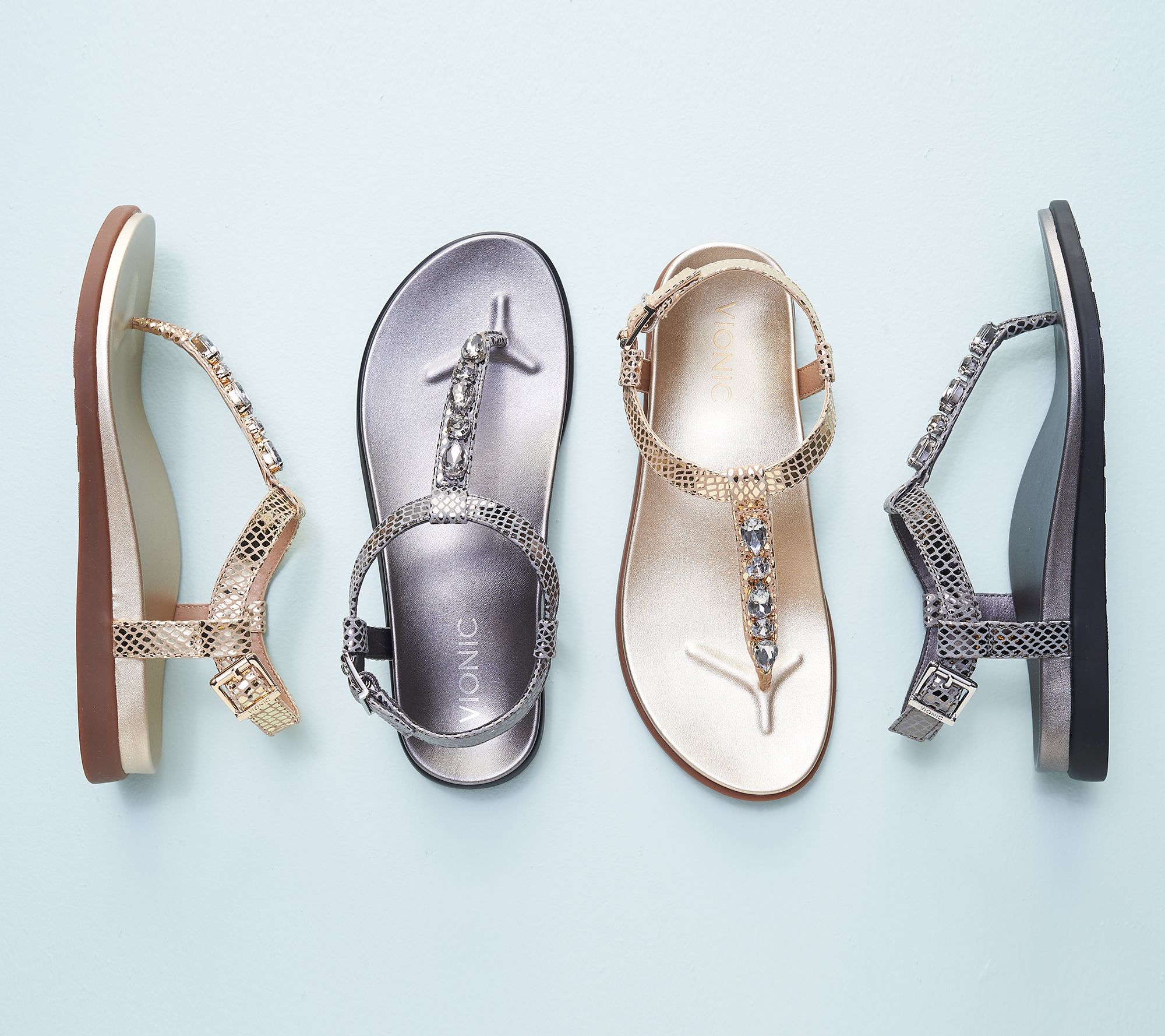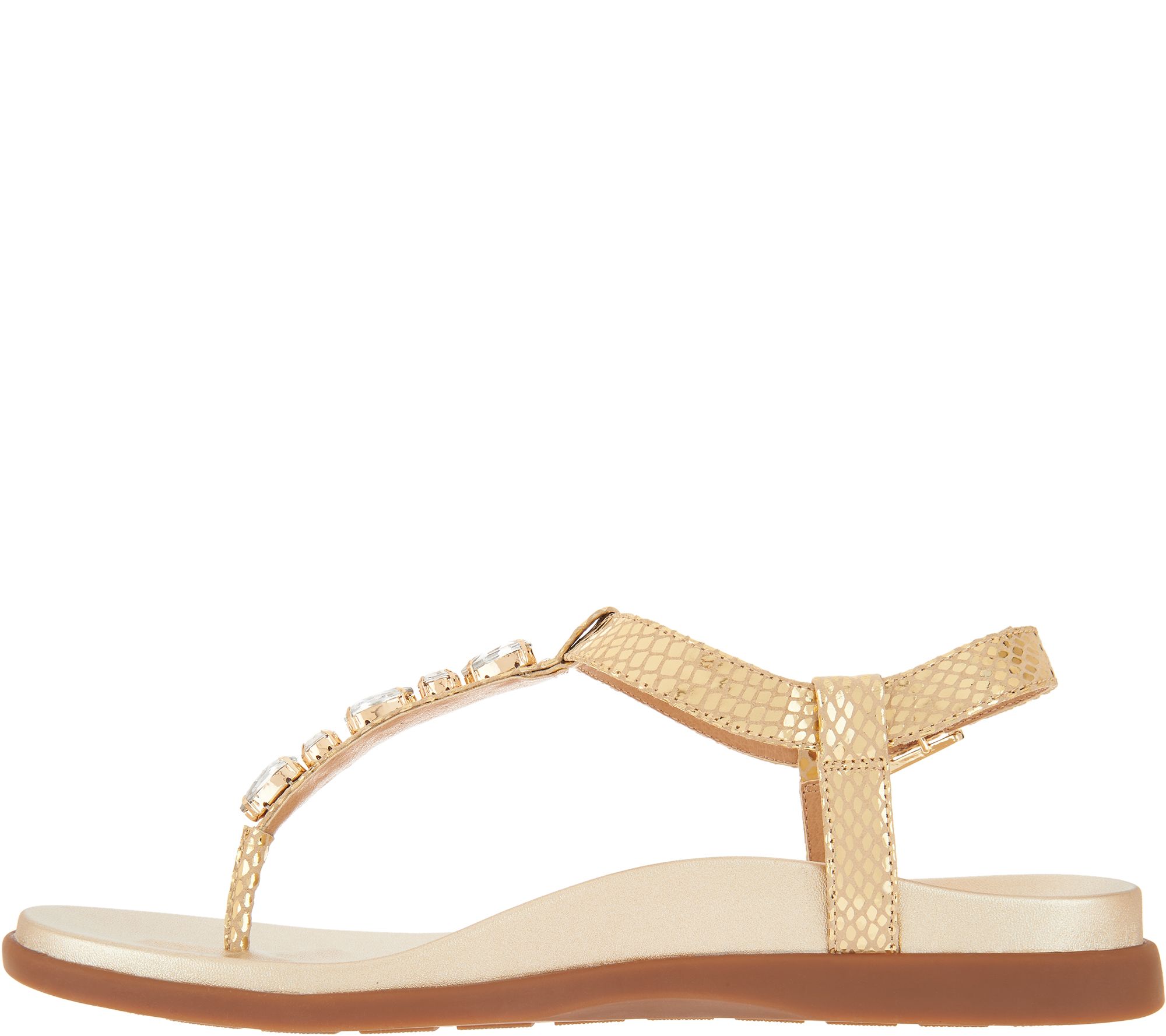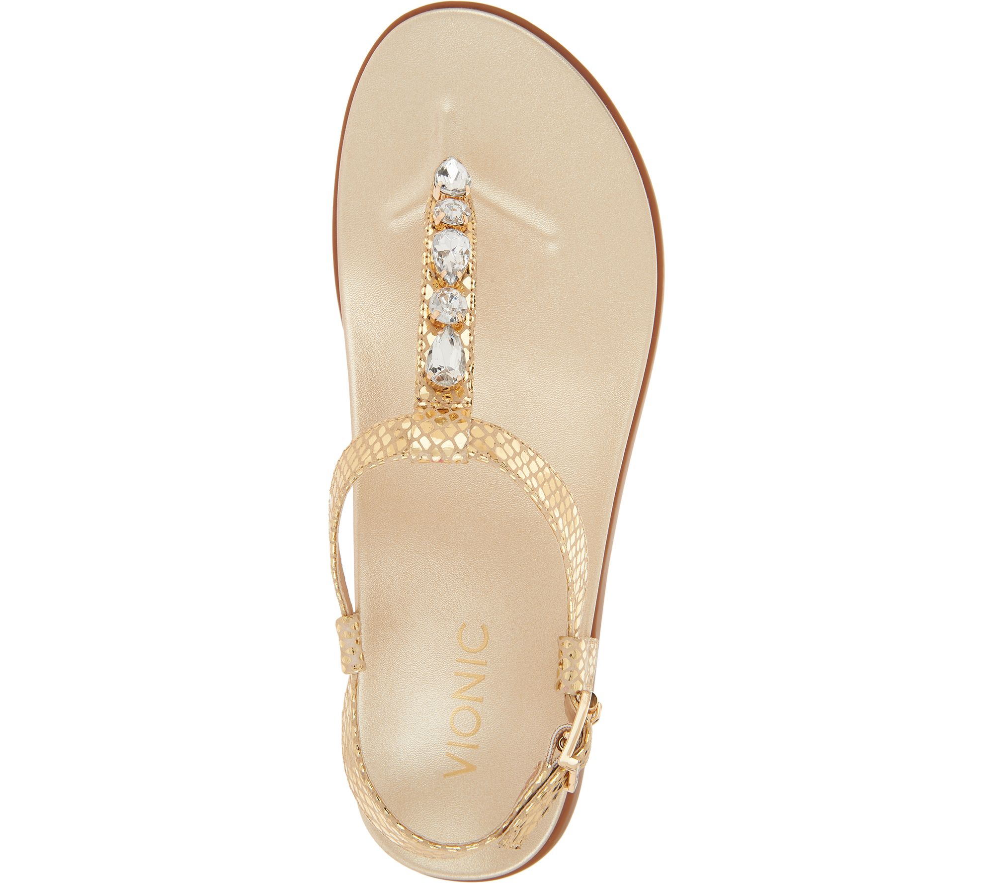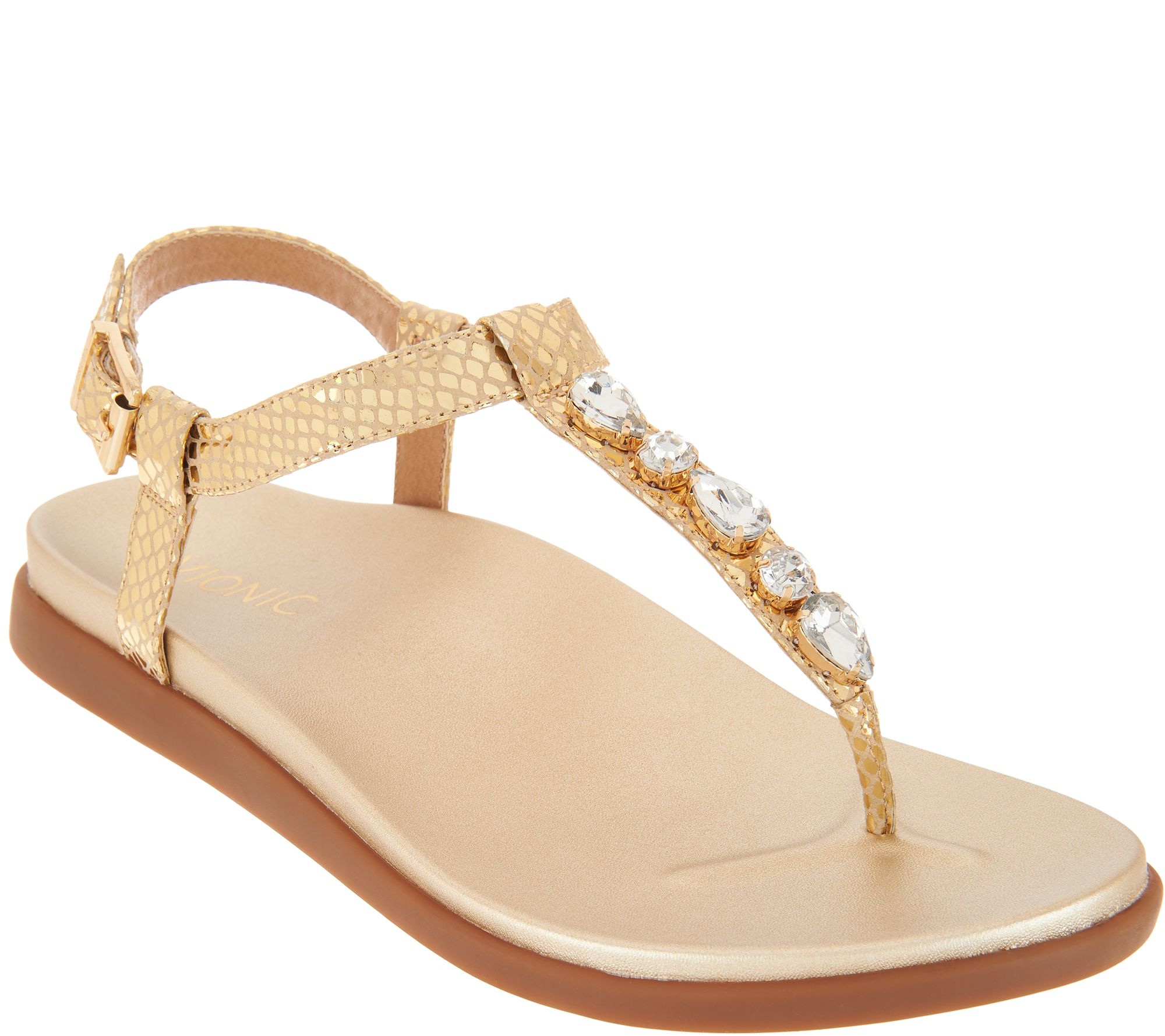 Chic summer sandal style is set on fire with the gleam of faux gemstones along a snake-printed leather T-strap. From Vionic®.