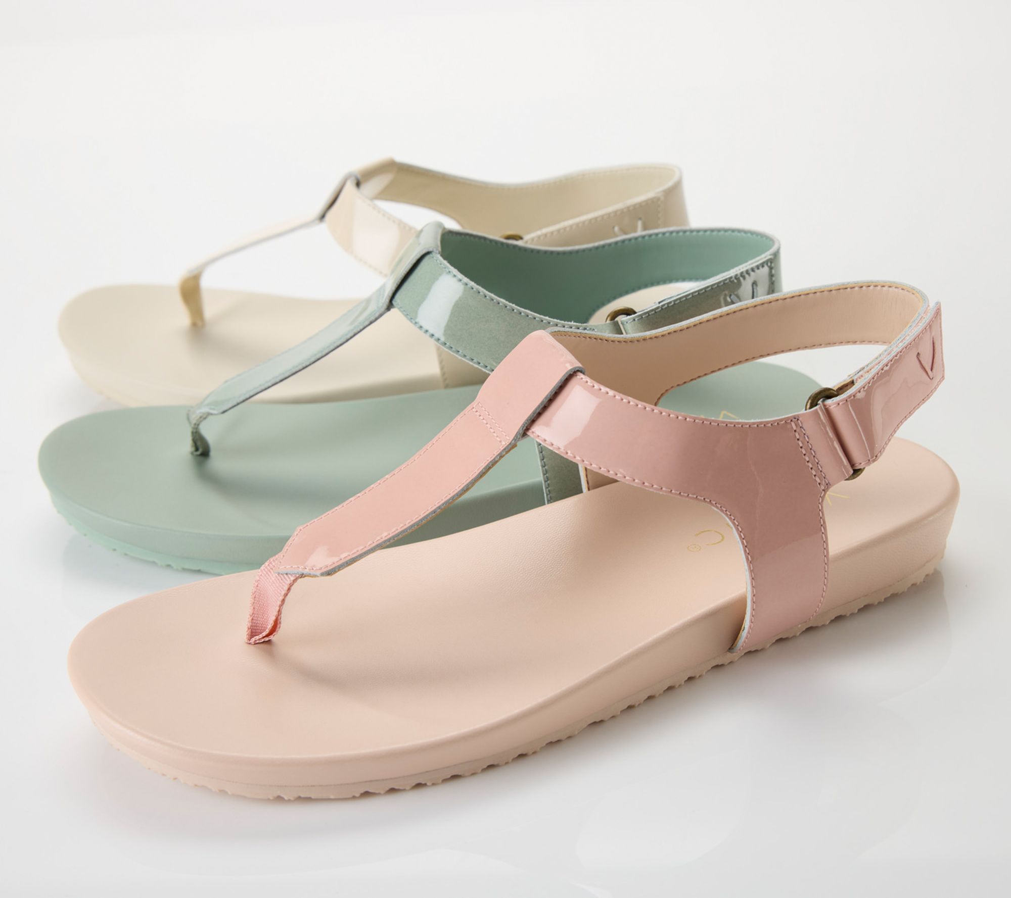 Adjustable T-strap with hook-and-loop back closure, hidden gore, Patricia toe post