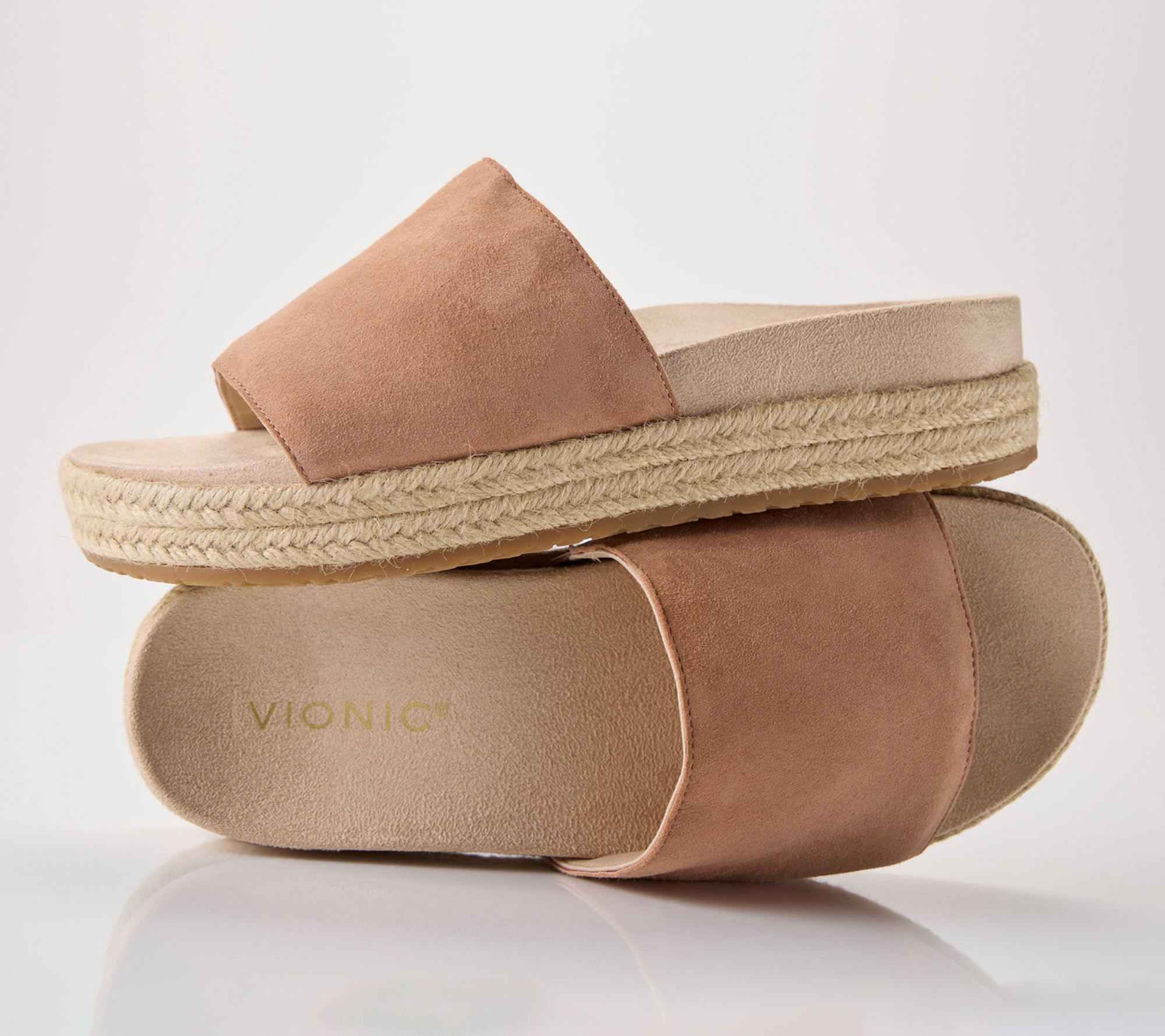 Weekend outings are easier to enjoy with these leather and suede slide sandals, combining an effortless espadrille-inspired design with a supportive platform and soft padding for every step. The contoured arch and deep heel cup offer stability and comfort, making these sandals a great pick for everything from brunch dates to beachside strolls. From Vionic®.