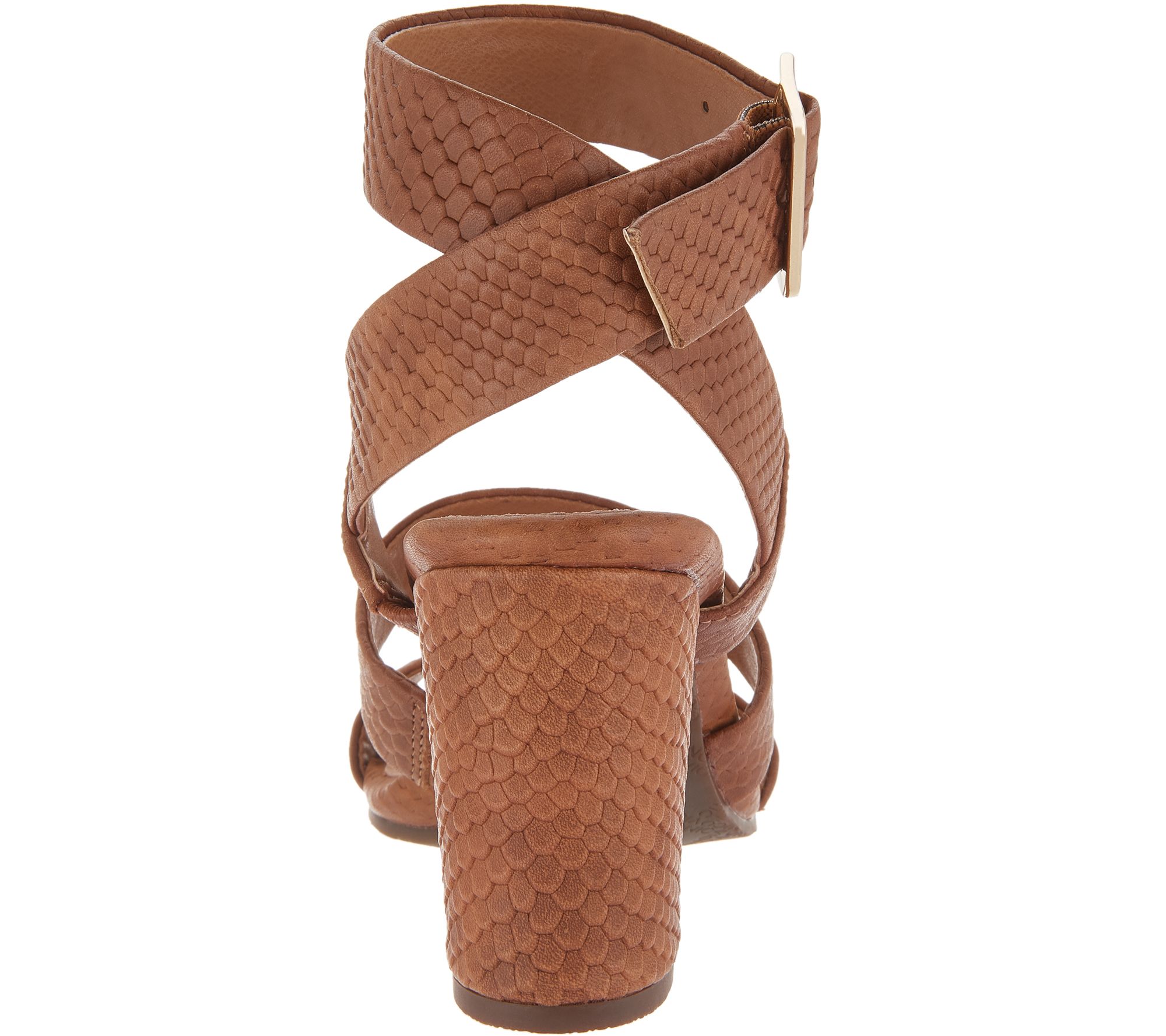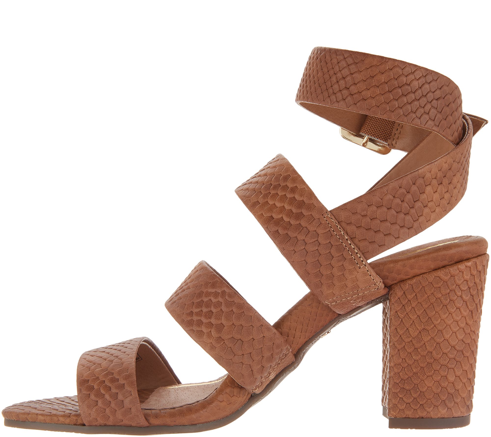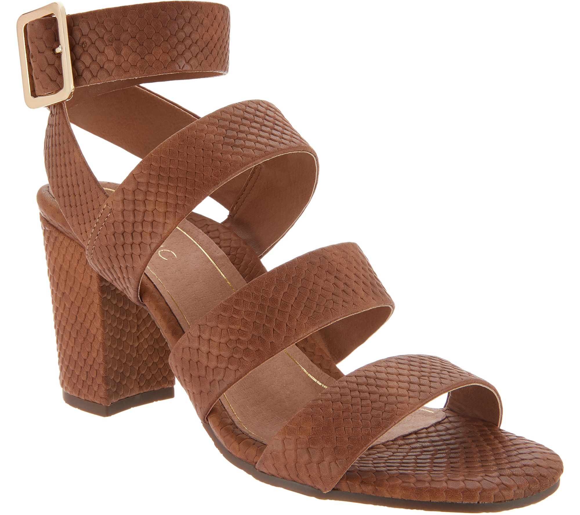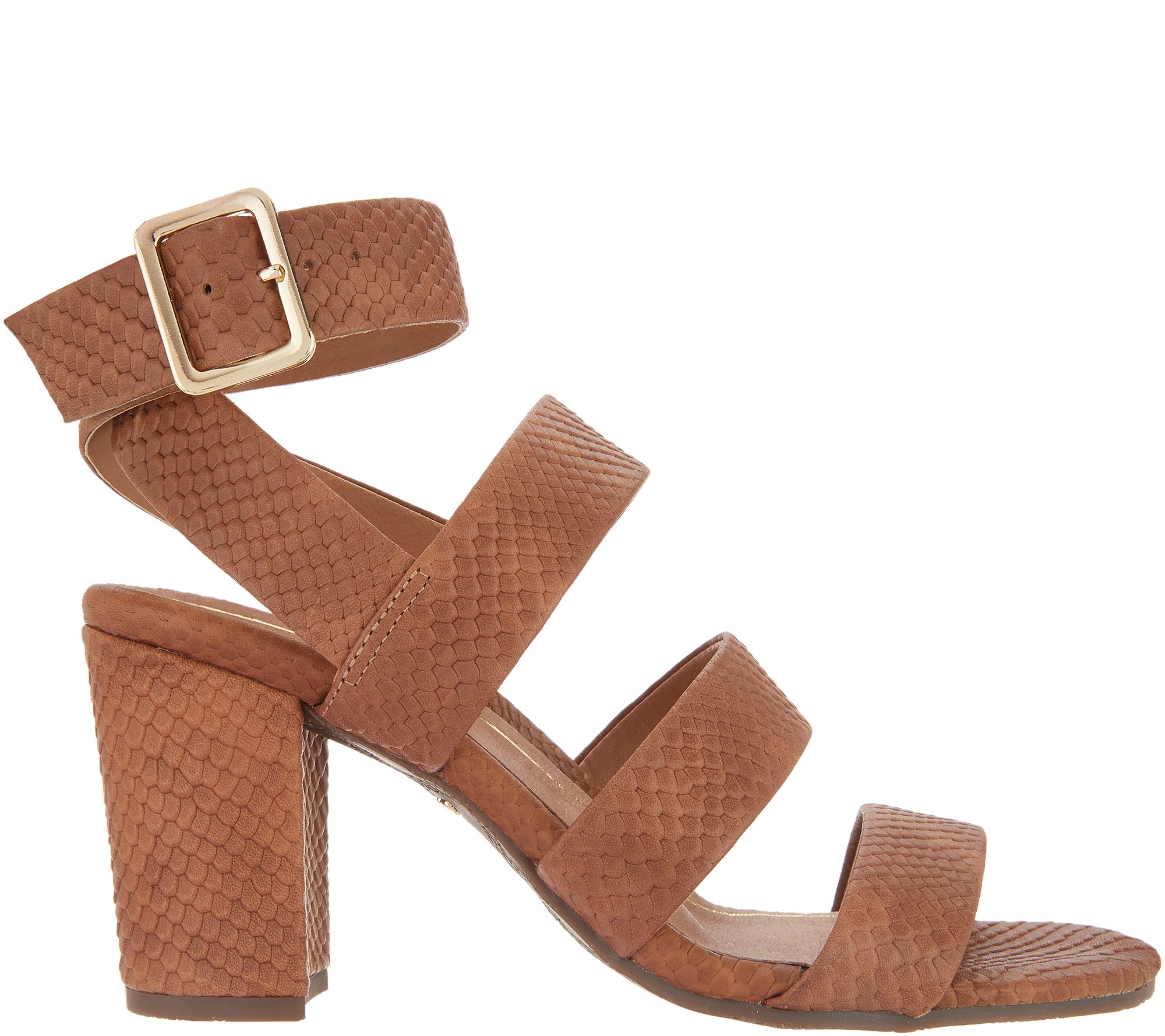 Snake-embossed leather upper, three straps across the vamp, ankle strap with adjustable metal buckle