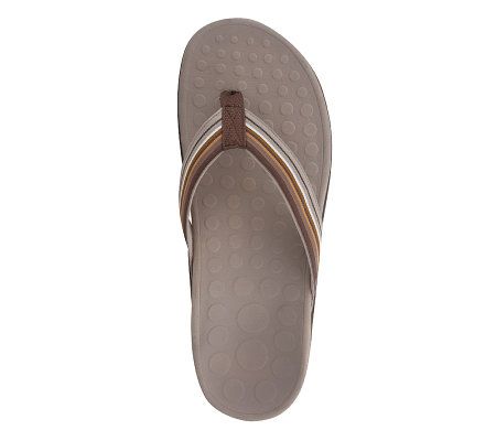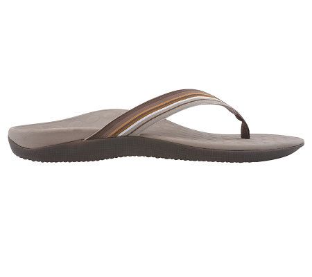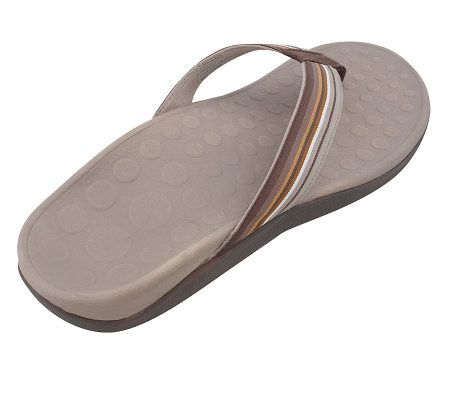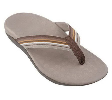Supportive and stylish, these ribbon-strap thong sandals are your feet's best friend through spring and summer. Created by a podiatrist, they have a unique, patented design with a built-in orthotic for incredible support. They're easy on the feet--and the colorful striped strap makes them easy on the eyes, too. Slip them on for all kinds of sunny fun!