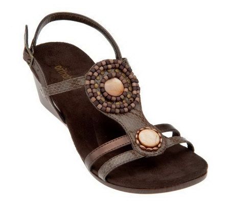Fancy footwork. A stylish, wood and faux gem detail gives these slingback sandals an exotic touch that's enhanced by faux snakeskin on the straps. Kick up your heels without worrying about comfort--they're designed to keep you feeling fab all day long. From Orthaheel.
