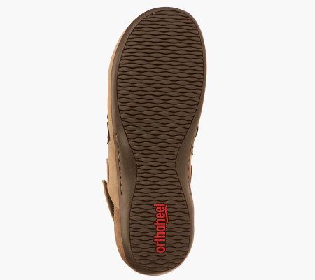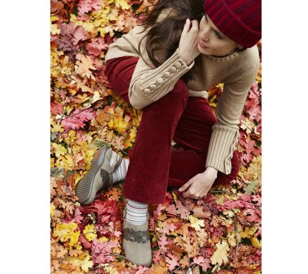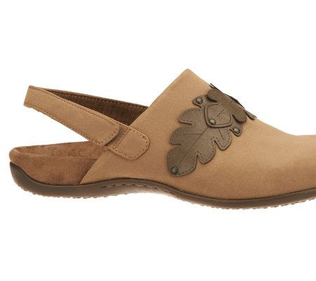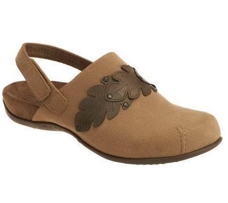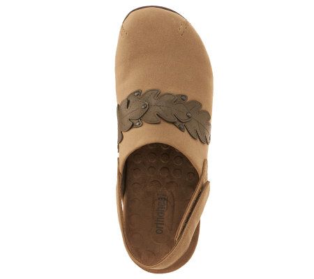 Fresh fall footwear. Antique-inspired leaf appliques lend autumnal style to the vamp of these slip-on mules. The hook-and-loop closure on the backstrap keeps the shoe comfortably in place--even when you're taking a walk in the brisk fall air. From Orthaheel.