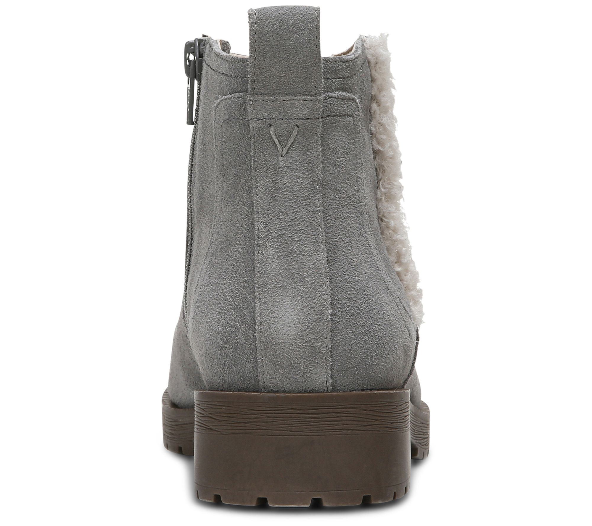 Water-repellent suede upper, sherpa detail, pull-tab heel, side zip