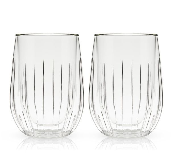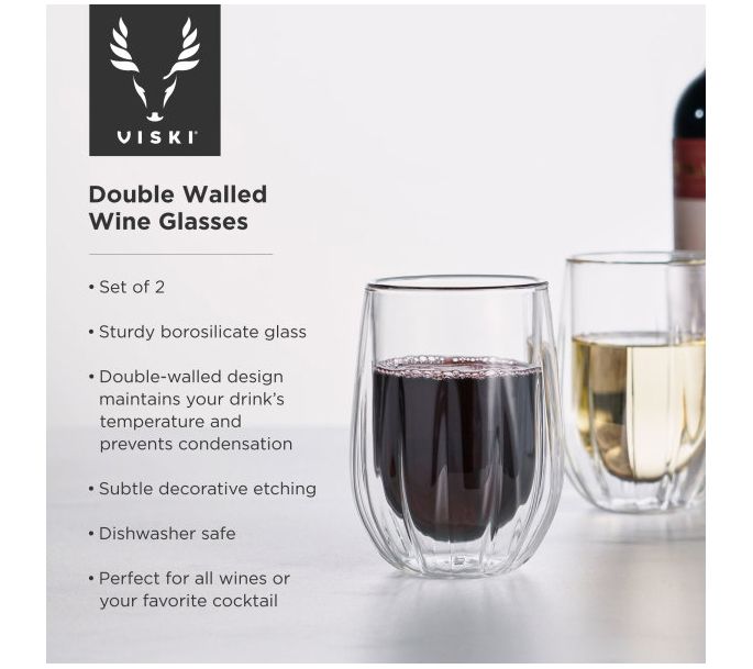 Take time to savor your wine with Viski wine glasses. The unique double-walled design maintains your wine's temperature and prevents condensation, ensuring a smooth sipping experience. Crafted from crystal, these glasses are both stylish and practical. From Viski.