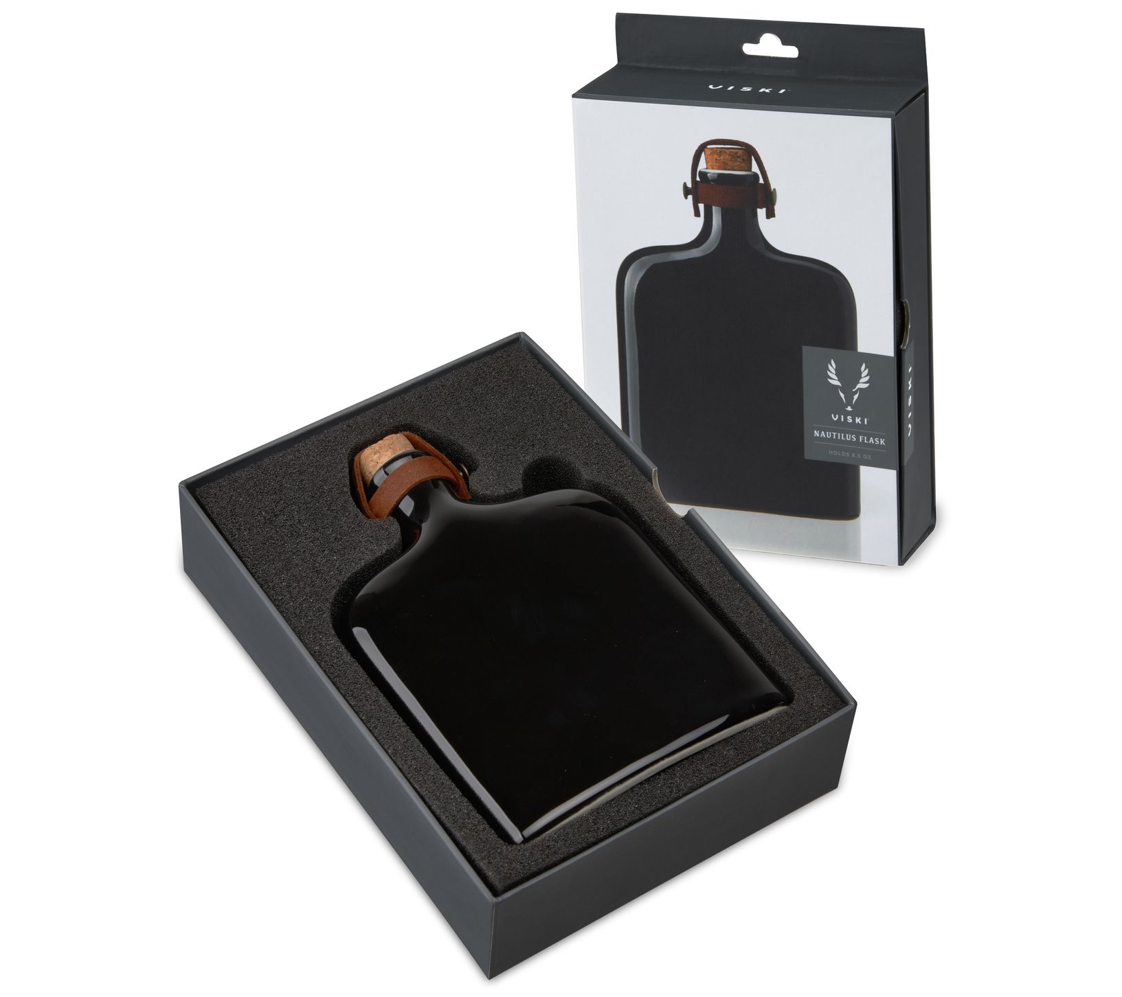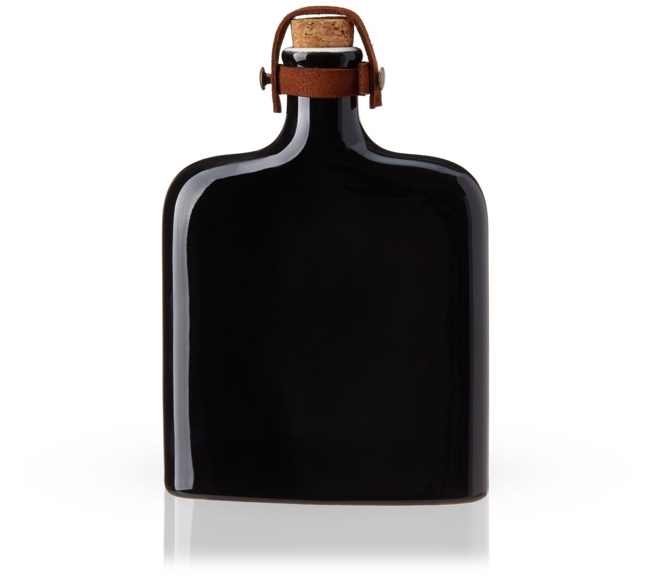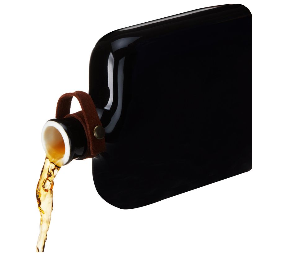 Elevate your bar setup with the Irving Nautilus ceramic flask. Its striking black glaze and leather strap make it a standout piece. Perfect for serving your favorite spirits, this flask features a natural cork stopper. From Viski.