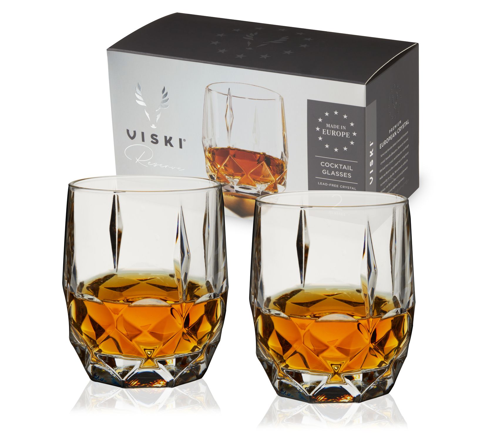 These stunning cocktail glasses blend European craftsmanship with a striking cut crystal design, offering an elegant touch to your favorite drinks. Whether you're enjoying a classic cocktail or whiskey neat, these glasses are suitable for any occasion. From Viski.