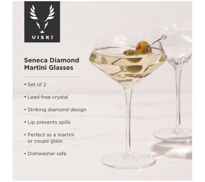 • Includes two 11-oz Seneca Crystal Diamond martini glasses
