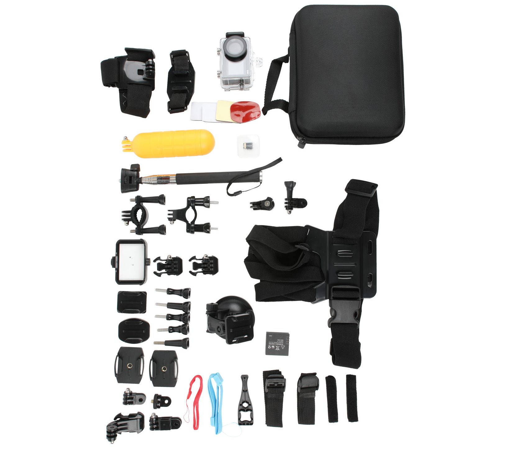 • Includes camera, 900mAh lithium-ion battery, 500mAh lithium-ion battery, bicycle handle bar mount, micro charging cable, chest mount, head mount, adhesive, wrist strap, car dash mount, waterproof case, selfie stick, floating grip, and 32GB SD card