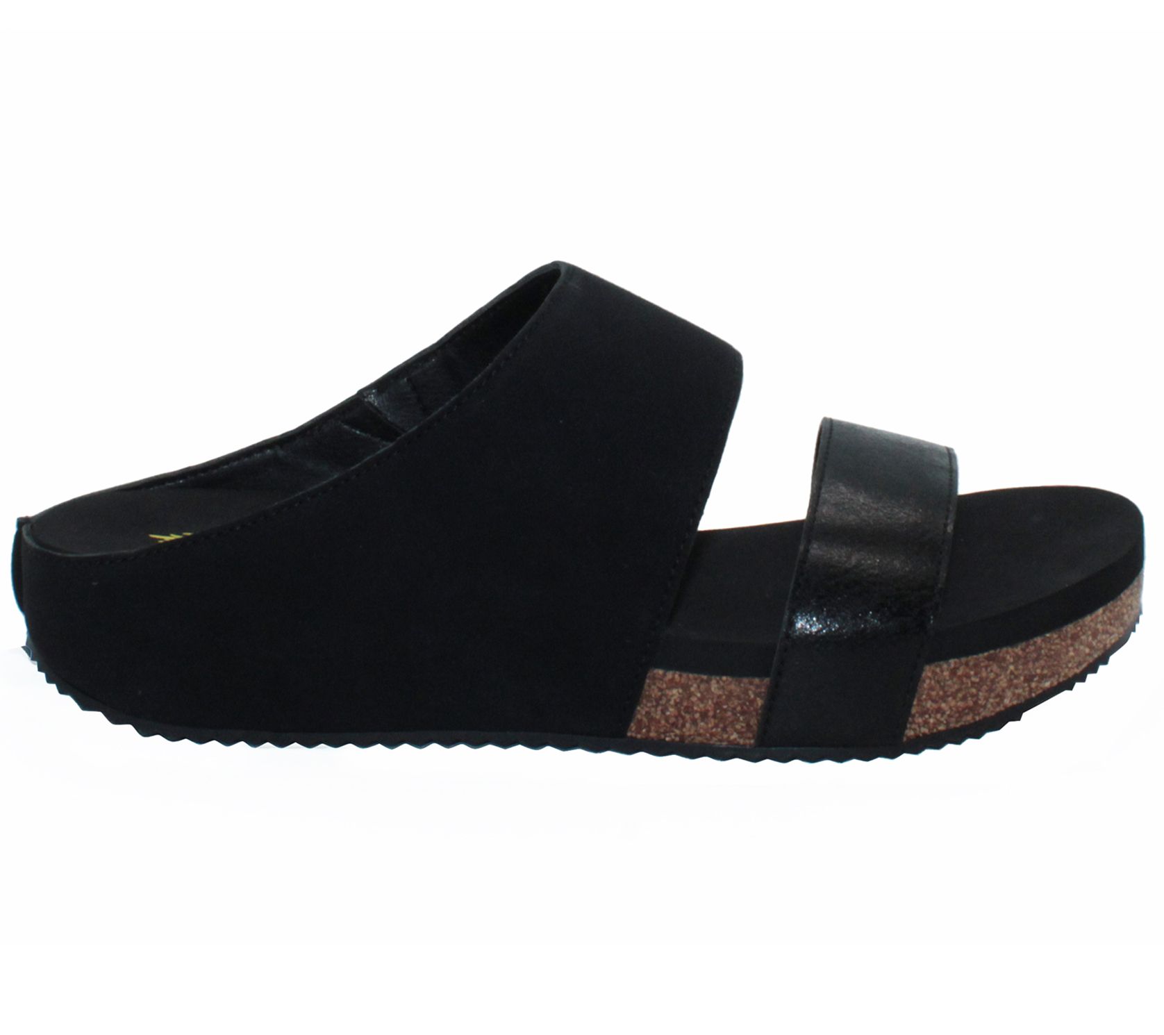 Step into style with this sandal featuring a cork wedge, rubber traction outsole, and a faux leather upper with a metallic strap. These slip-on sandals are perfect for any occasion, ready to pair with jeans or a flowy dress for a chic look. From Volatile.