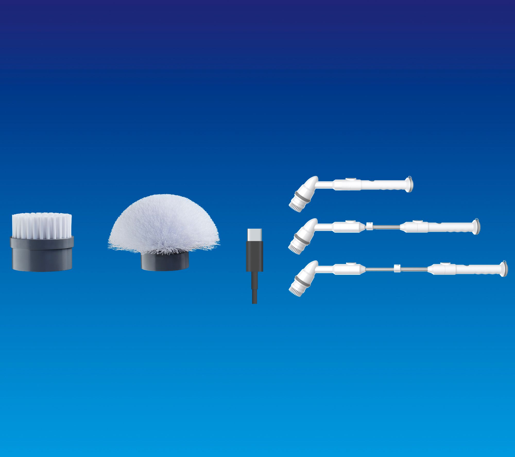 Includes Voom Handheld Cordless Power Spin Scrubber, all-purpose brush, and heavy-duty brush