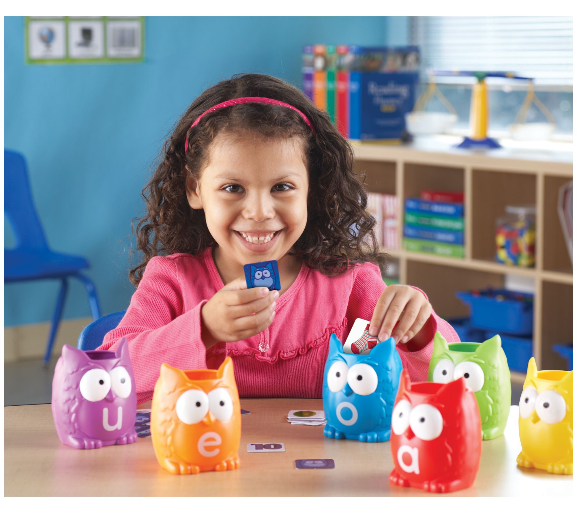• 106-pc set includes 5 colorful vowel owls, 1 blank owl, and 100 picture cards