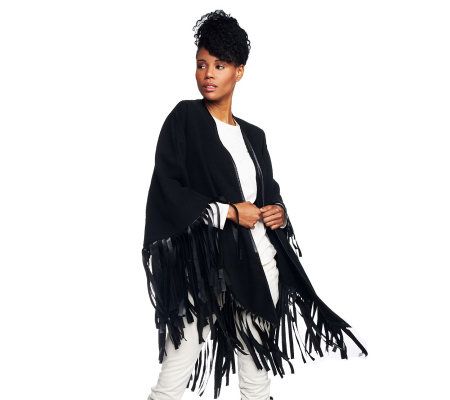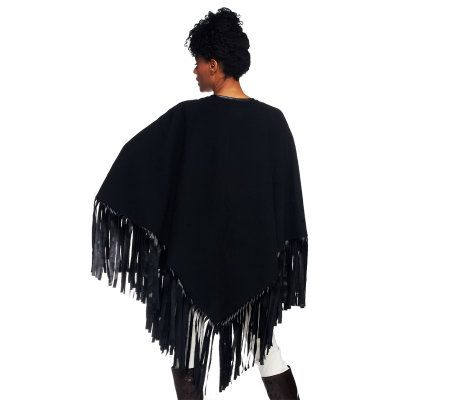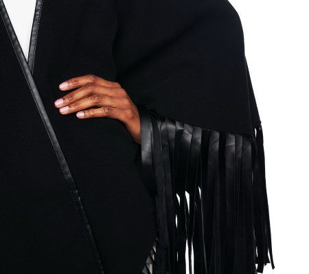 Caped crusader. Set the standard for style in this faux wool cape. While the silhouette is stunning, the faux leather binding and fringe along the hem are what give this look its super powers. From VT Luxe.