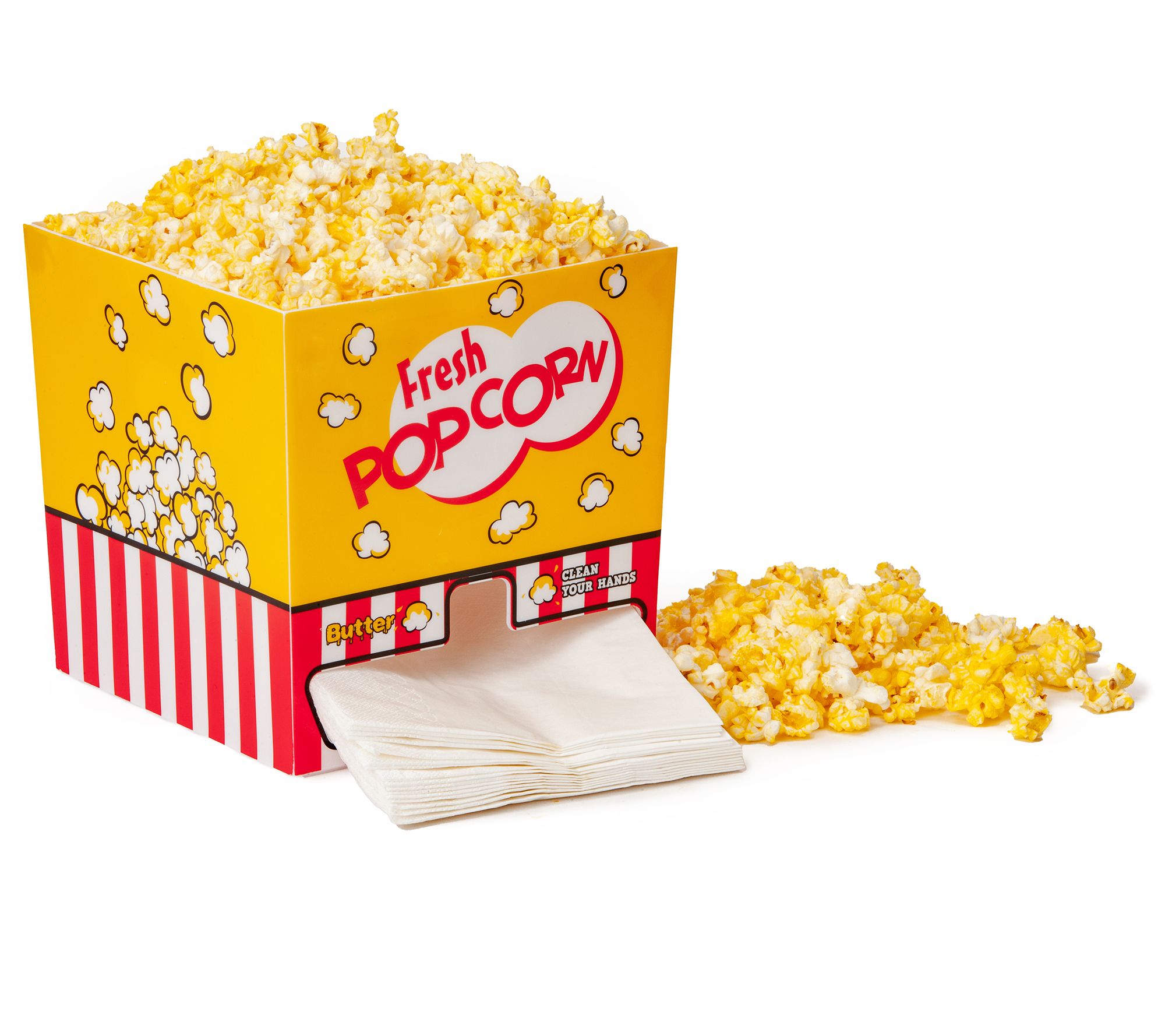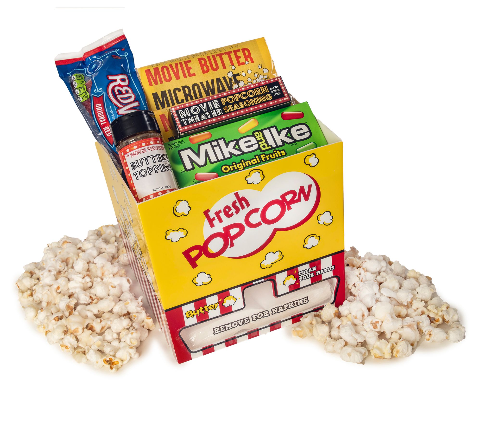 • Includes popcorn tub with napkins, two 2.75-oz Buttery Bags of microwave popcorn, 3-oz Mouth Watering Buttery Topping, 0.35-oz Movie Theater Style popcorn seasoning, 3.5-oz Skittles, 2.5-oz Twizzler Strawberry Twists