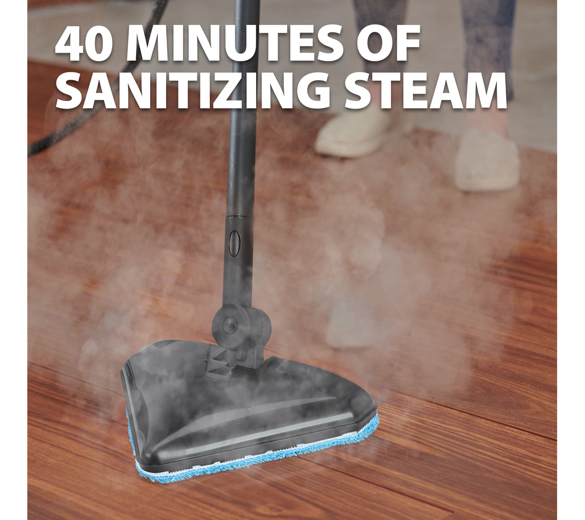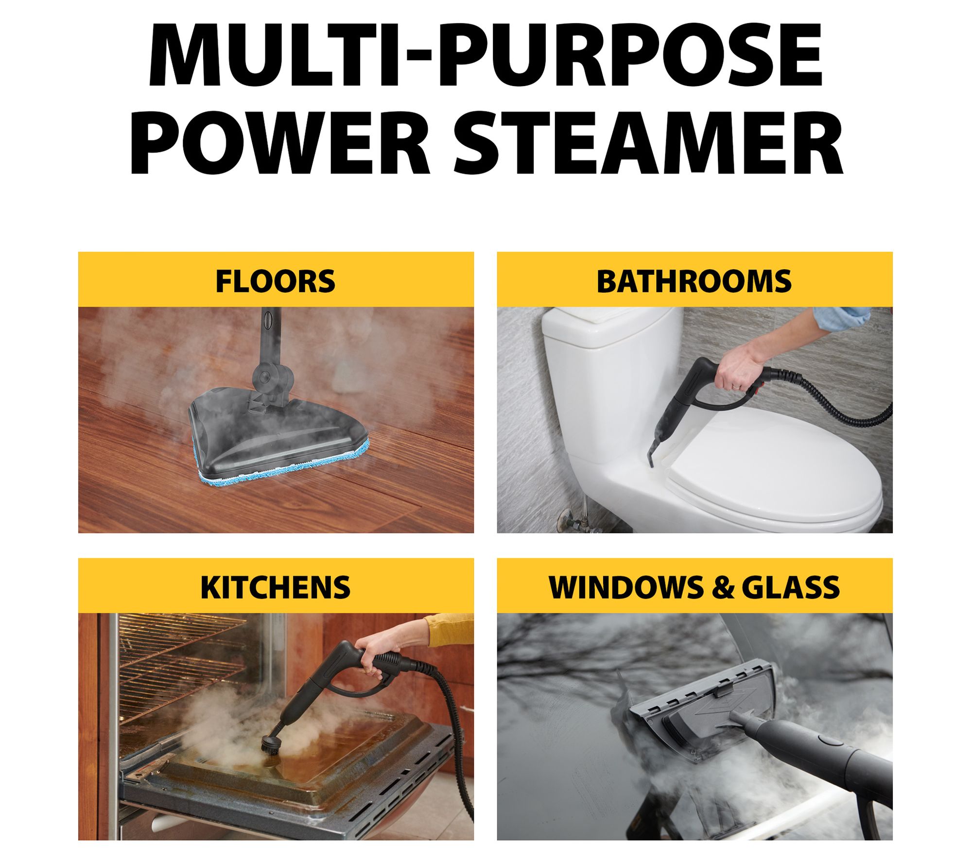 • Includes 925e Elite Steam Cleaner, window/tile squeegee, fabric steamer, straight adaptor, microfiber bonnet, microfiber towel, triangular carpet glide, triangular poly cotton pad, triangular microfiber pad, jet nozzle, two extension poles, small brass utility brush, large brass utility brush, two small nylon utility brushes, two large nylon utility brushes, funnel, and measuring cup