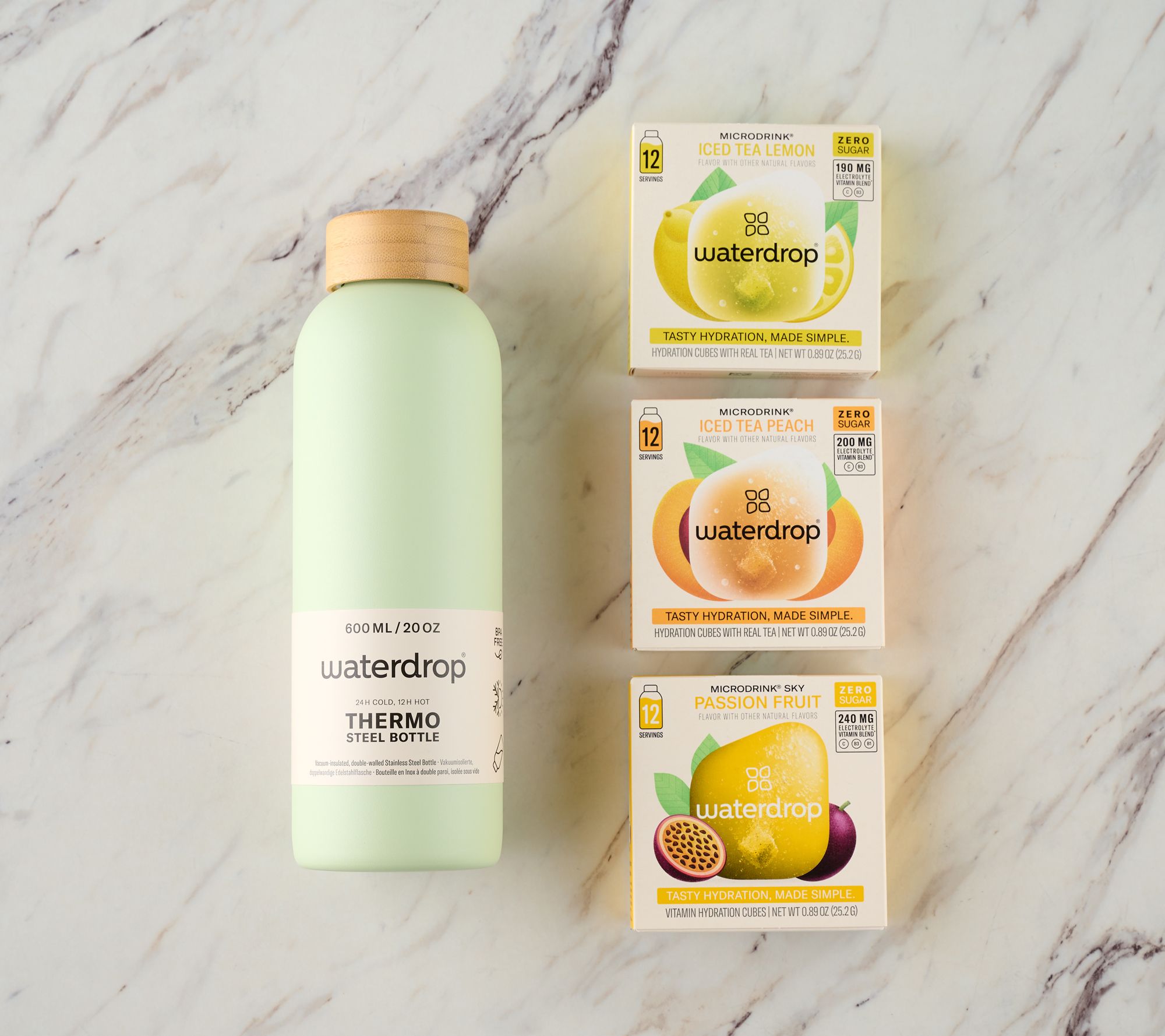 • Includes 20-oz double-walled stainless steel bottle and three 12-packs of dissolving hydration cubes in Iced Tea Lemon, Passion Fruit, and Iced Tea Peach flavors