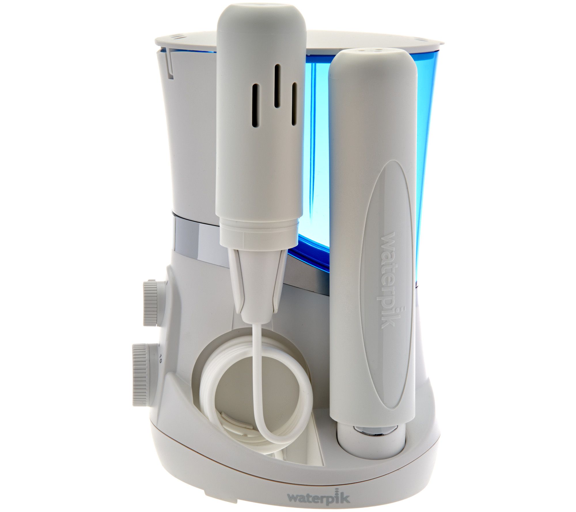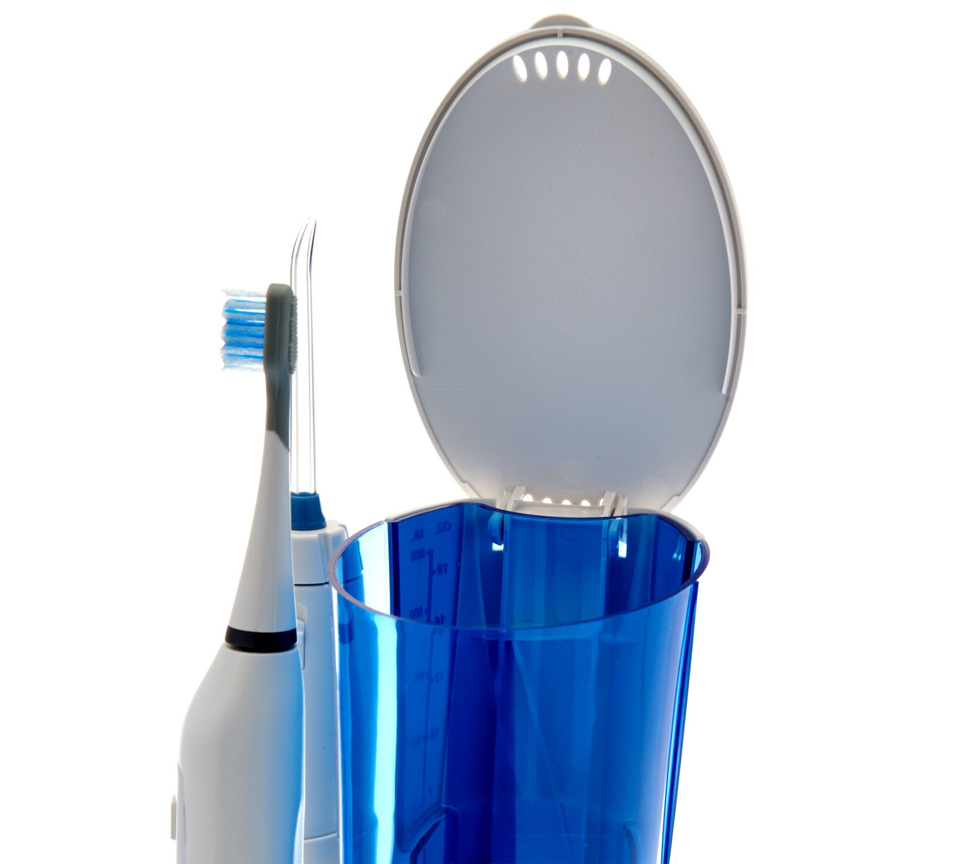 Includes water flosser with six tips, sonic toothbrush with five brush heads, hinged 20-fl oz water reservoir, rechargeable NiMH battery, travel case, and tip storage case