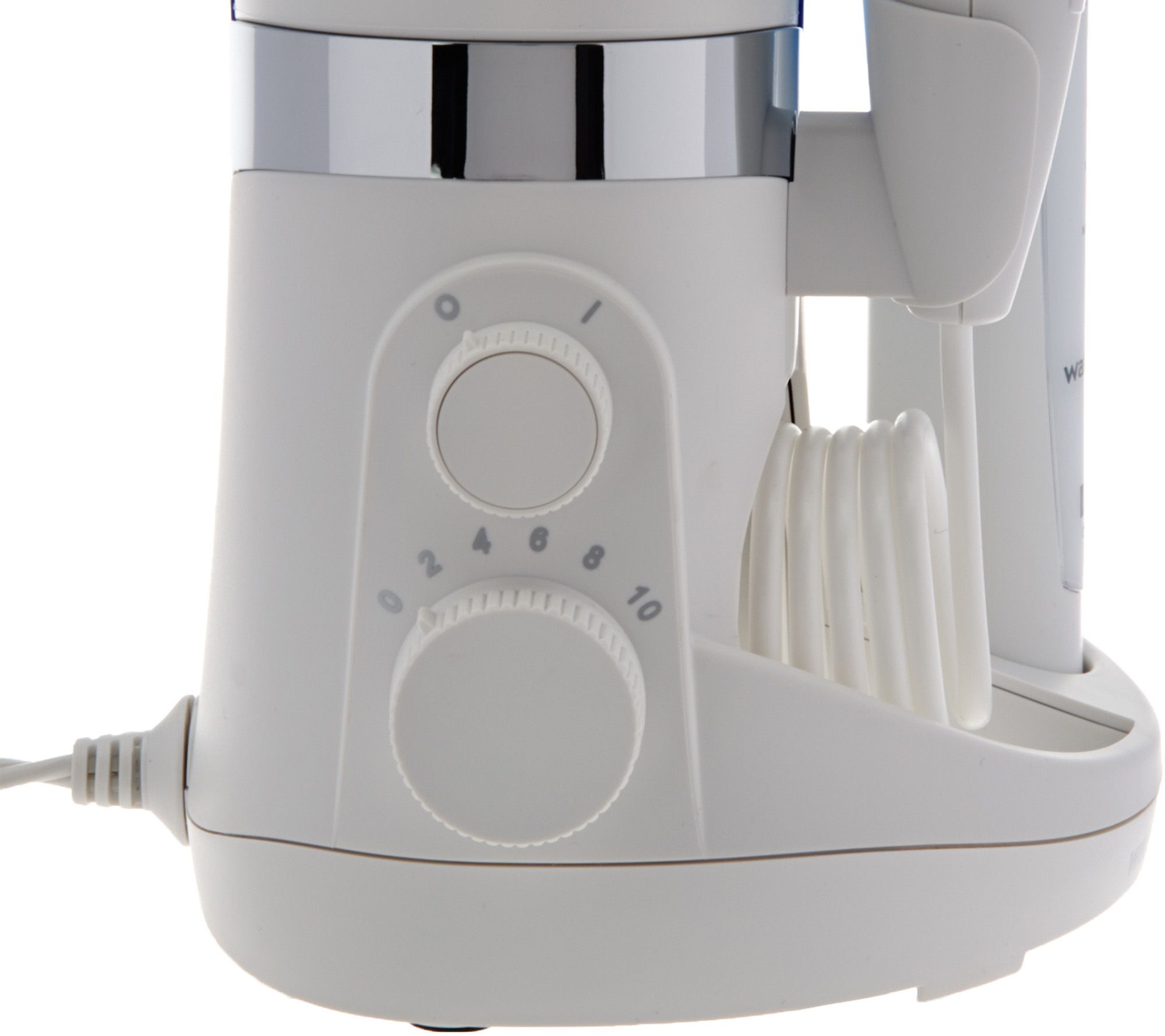 Water flosser: two classic jet tips, Plaque Seeker tip, orthodontic tip, Pik Pocket tip, and tongue cleaner tip; tips rotate 360 degrees; 10 pressure settings; on/off water control on handle; 90 seconds of water capacity; can be used with favorite mouthwash