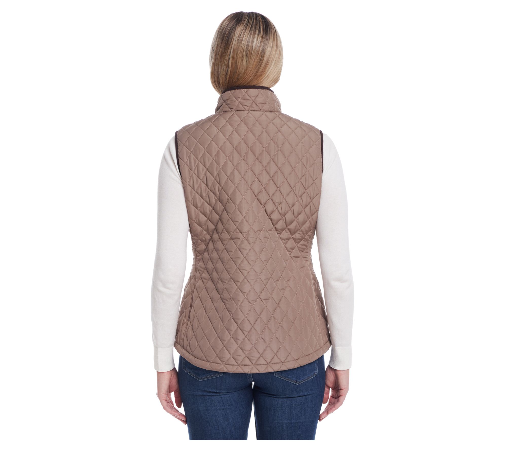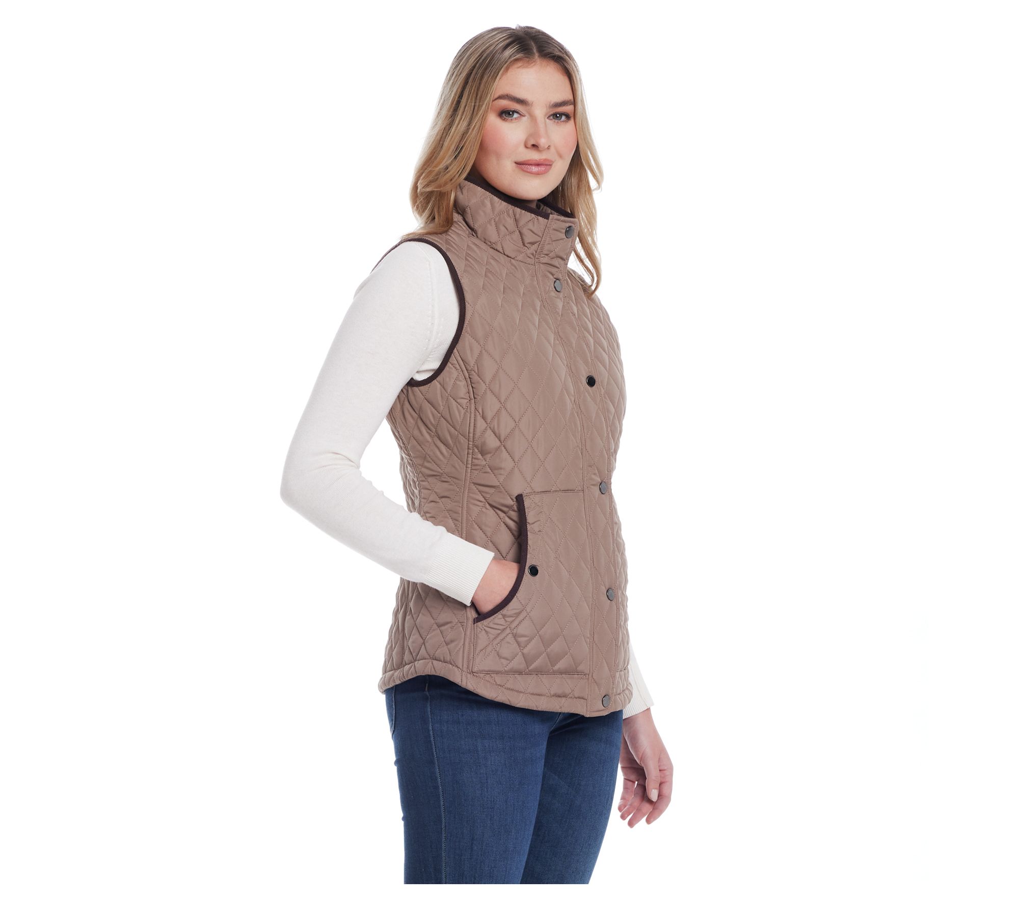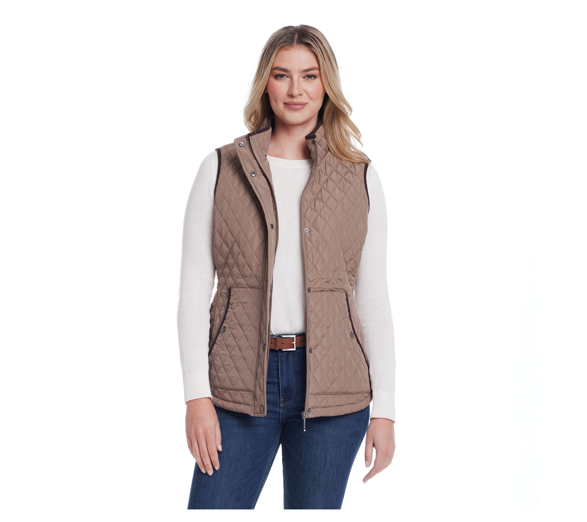 Cover up in this corduroy-trimmed diamond quilted vest. The sleeveless topper features a zip and snap front closure, two patch pockets, and a curved hemline for a flattering fit. Perfect for transitional weather, it will keep you warm and snug during chilly-weather days. From Weatherproof.