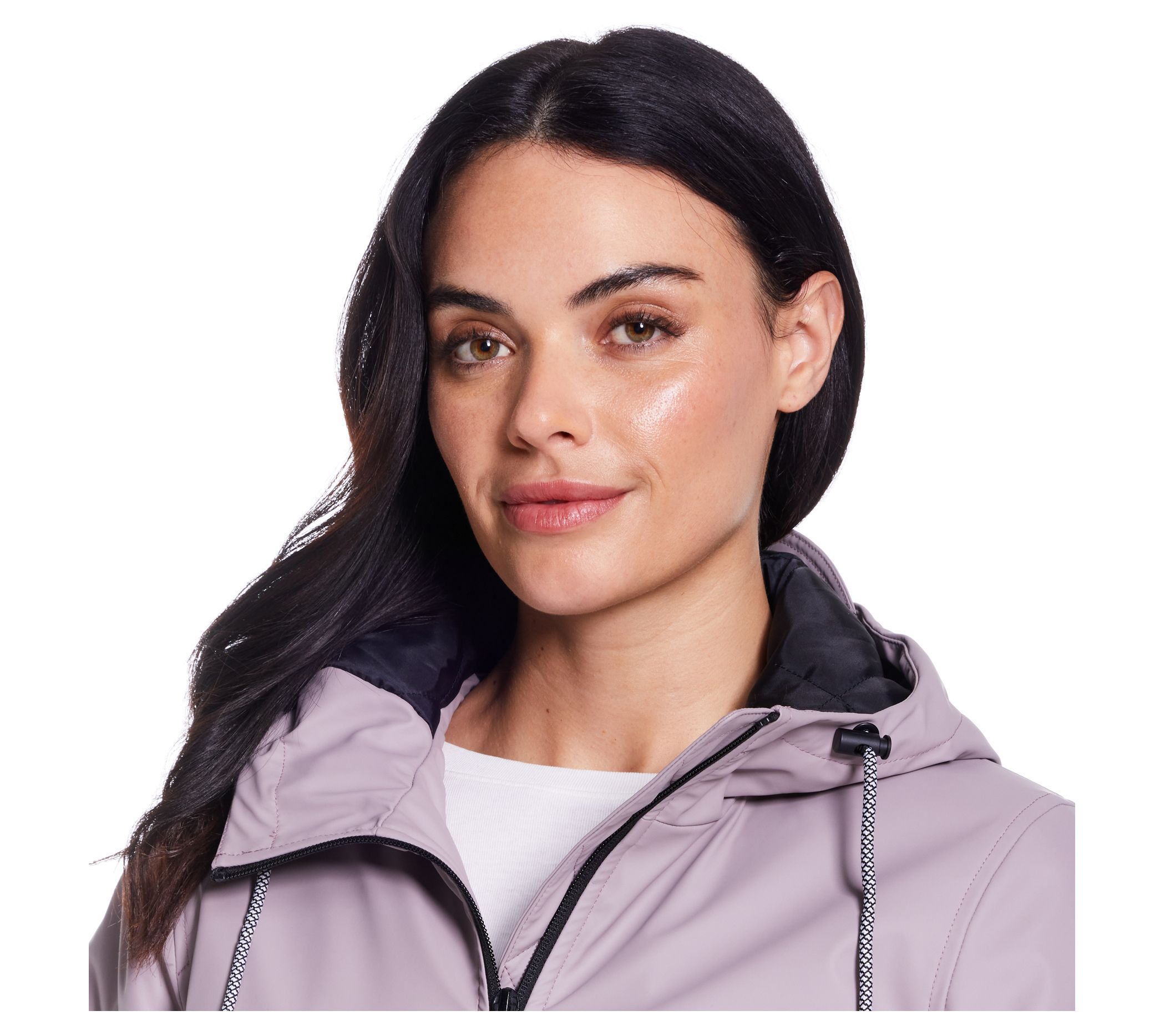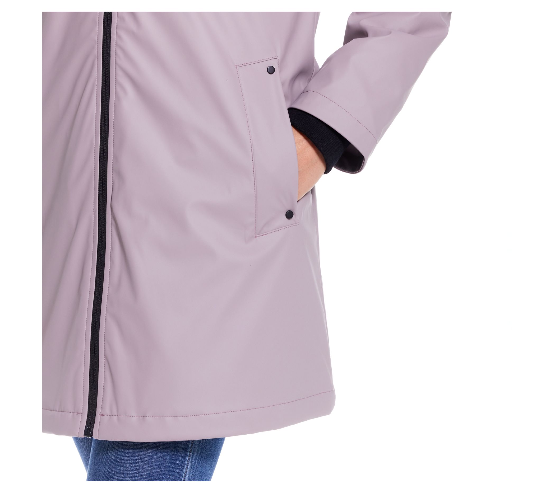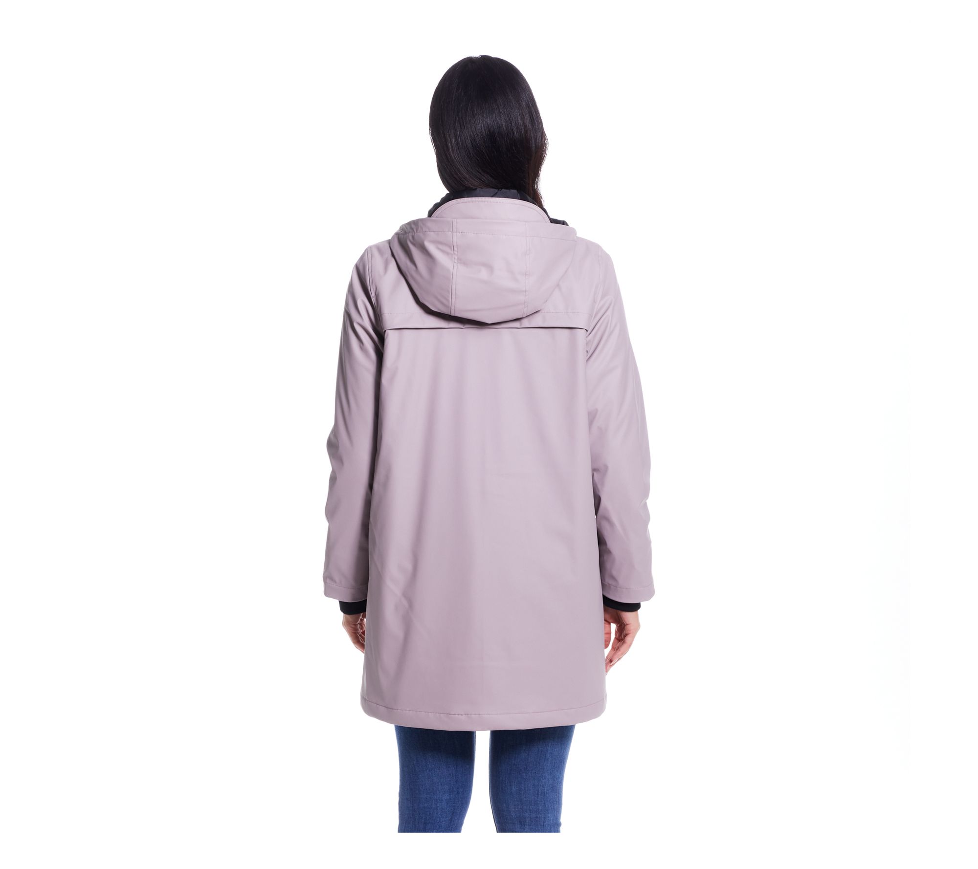 • Features: hooded rain slicker, welt pockets with rivet details, ribbed knit storm cuffs, lightly quilted lining, back yoke detail