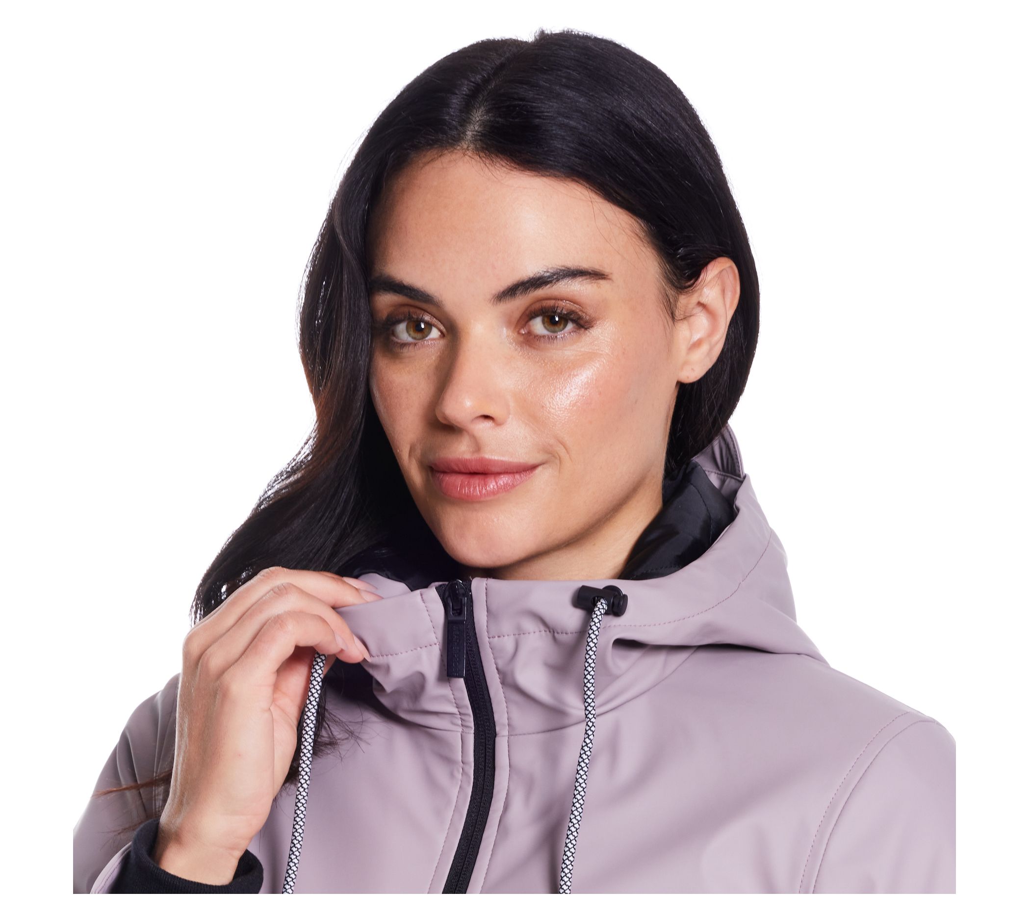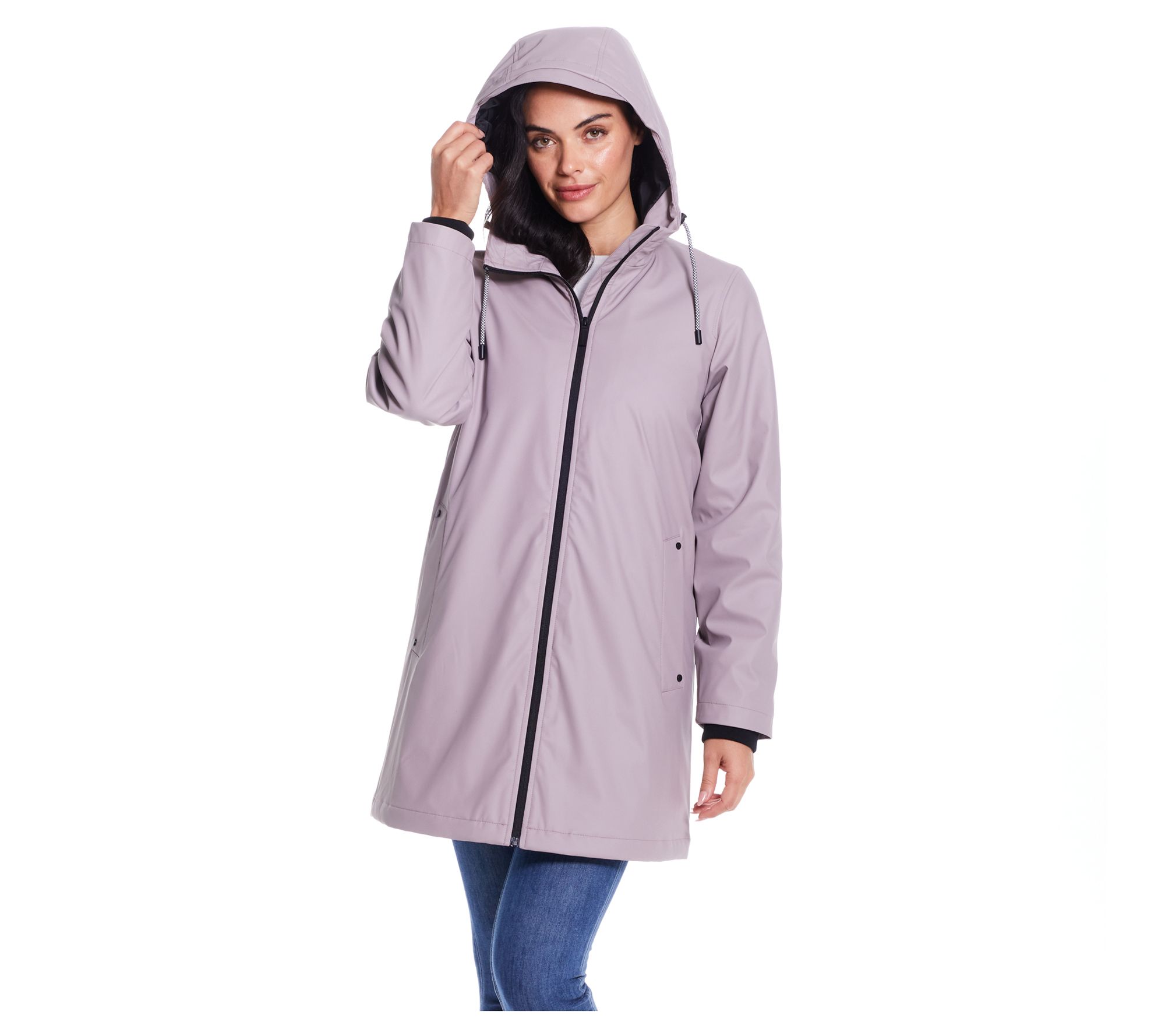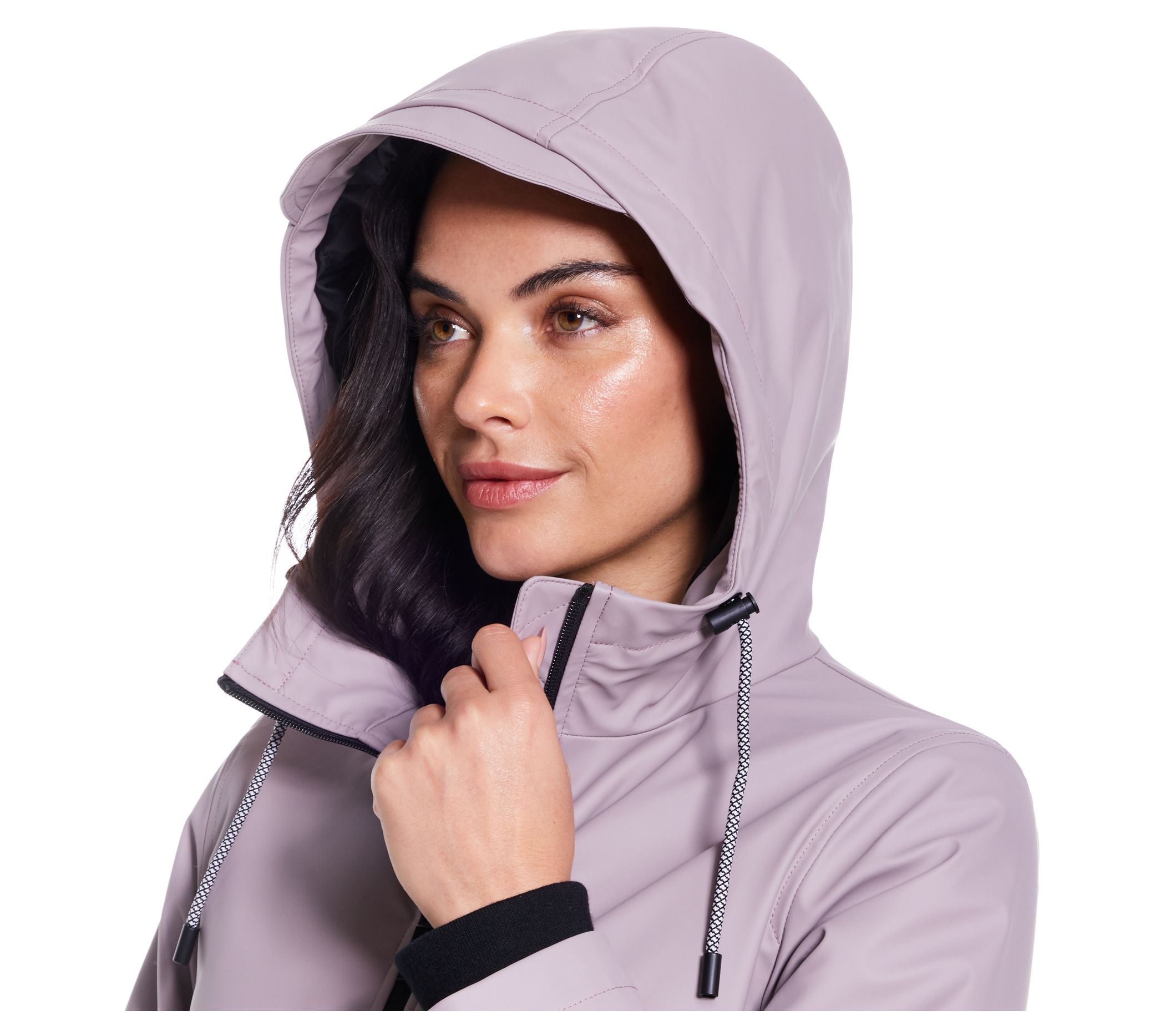 • Features: hooded rain slicker, welt pockets with rivet details, ribbed knit storm cuffs, lightly quilted lining, back yoke detail