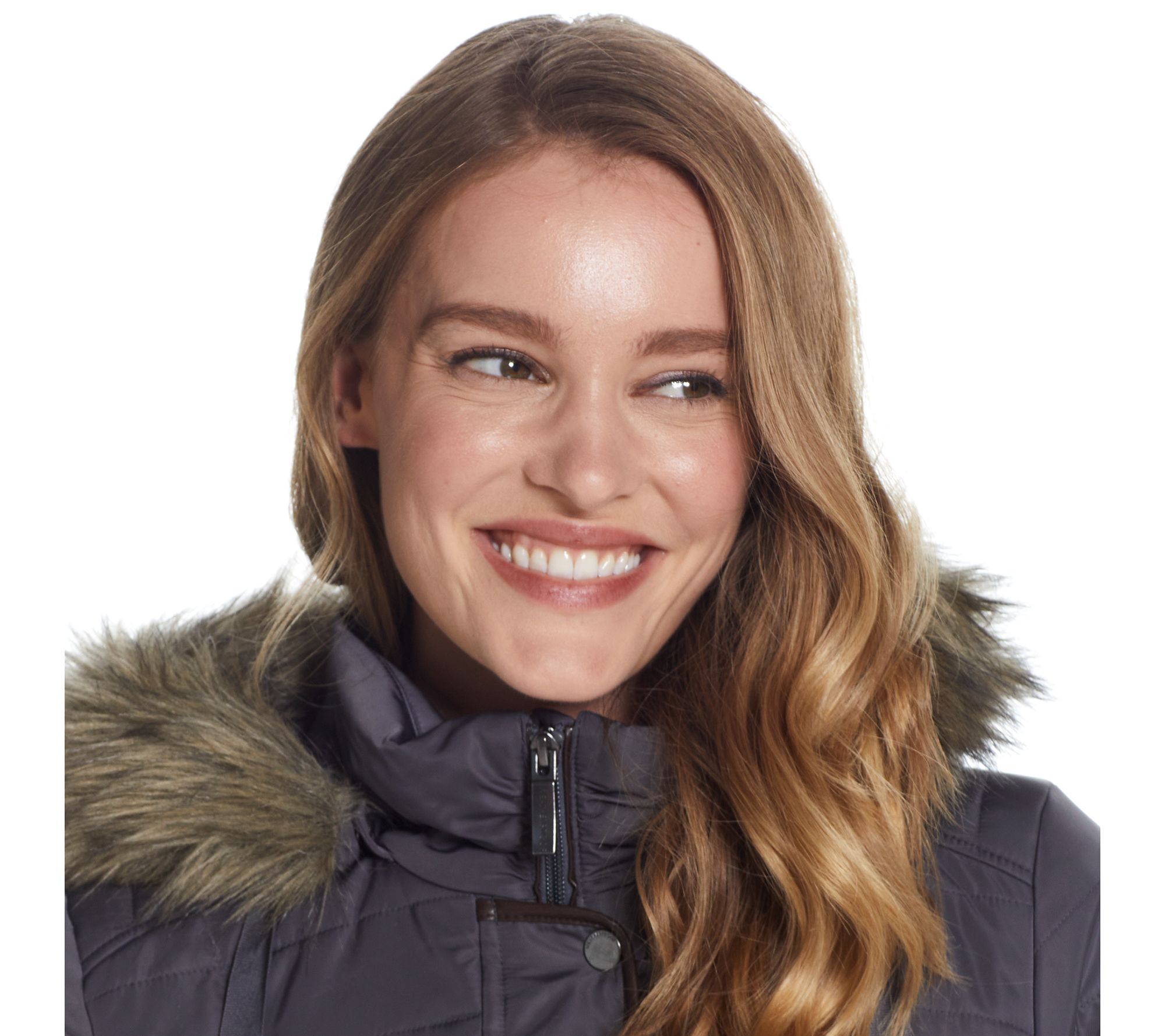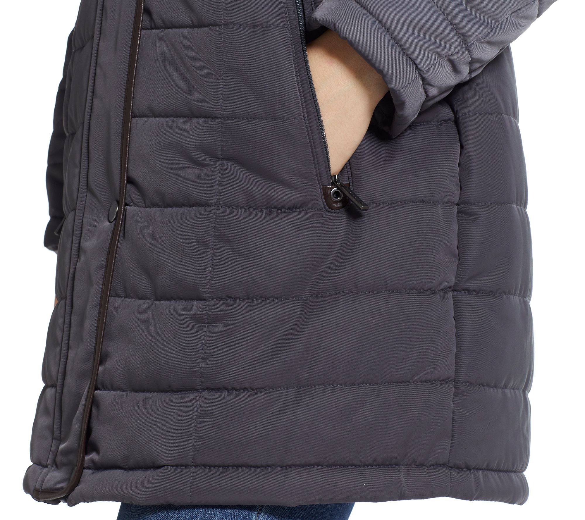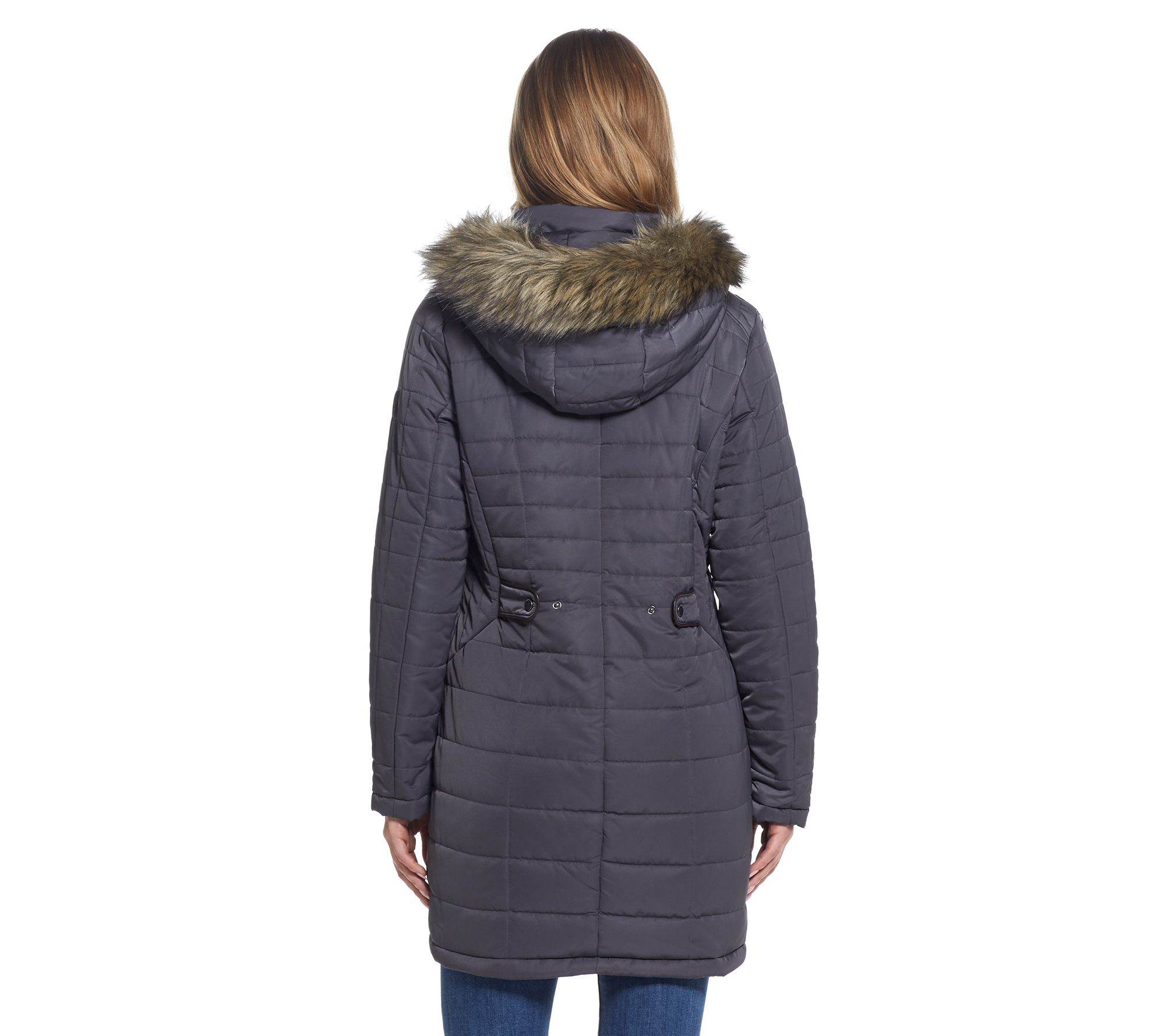 • Features: quilted, cascading collar, detachable hood, faux fur trim, long sleeves, mid-length hem