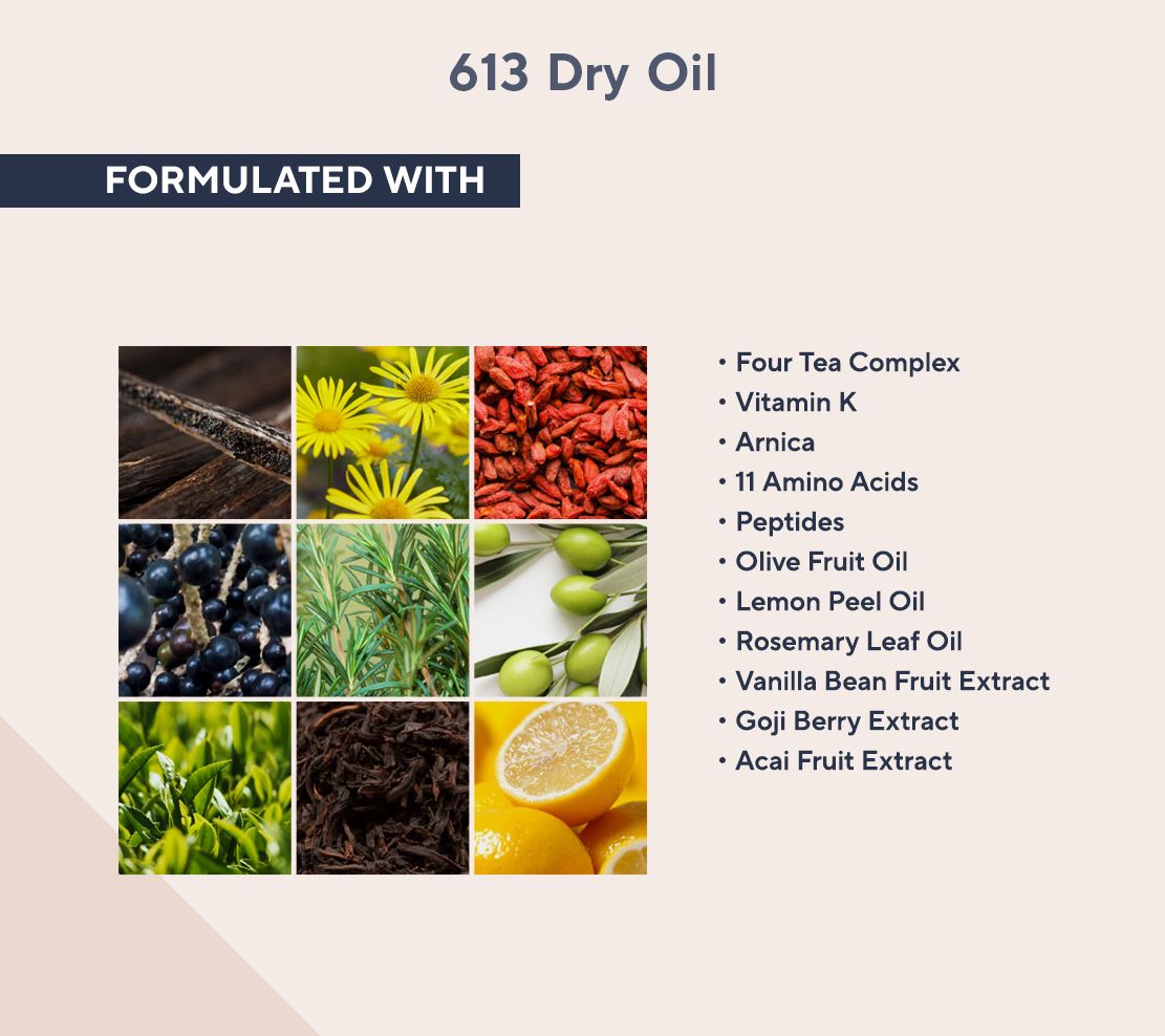 This 613 Dry Oil Intensive Treatment Spray is perfect for hair and skin. It has SPF 20 sunscreen protection and is infused with lemon, rosemary, and vanilla bean. This dry oil blends vitamins (including vitamin K), arnica, botanical extracts, 11 amino acids, and peptides. It also includes four tea extracts and moisturizes, helping to improve the look of dry skin.
