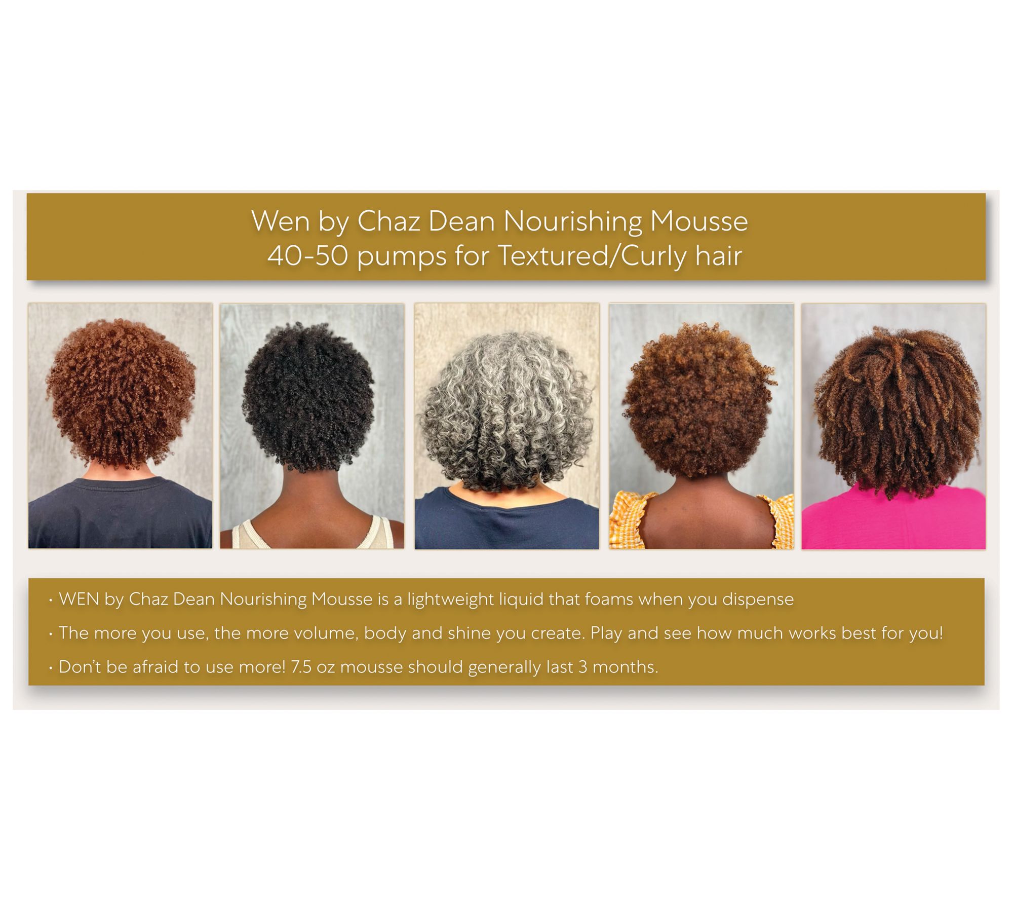 Next, temporarily improve the look of hair volume, body, and shine with WEN Nourishing Mousse. When blow-drying, this lightweight mousse holds your style. If air-drying, it helps smooth, polish, and finish while temporarily reducing frizz. This moisturizing formula leaves hair looking soft, shiny, and touchable. It's suitable for all hair types and textures.