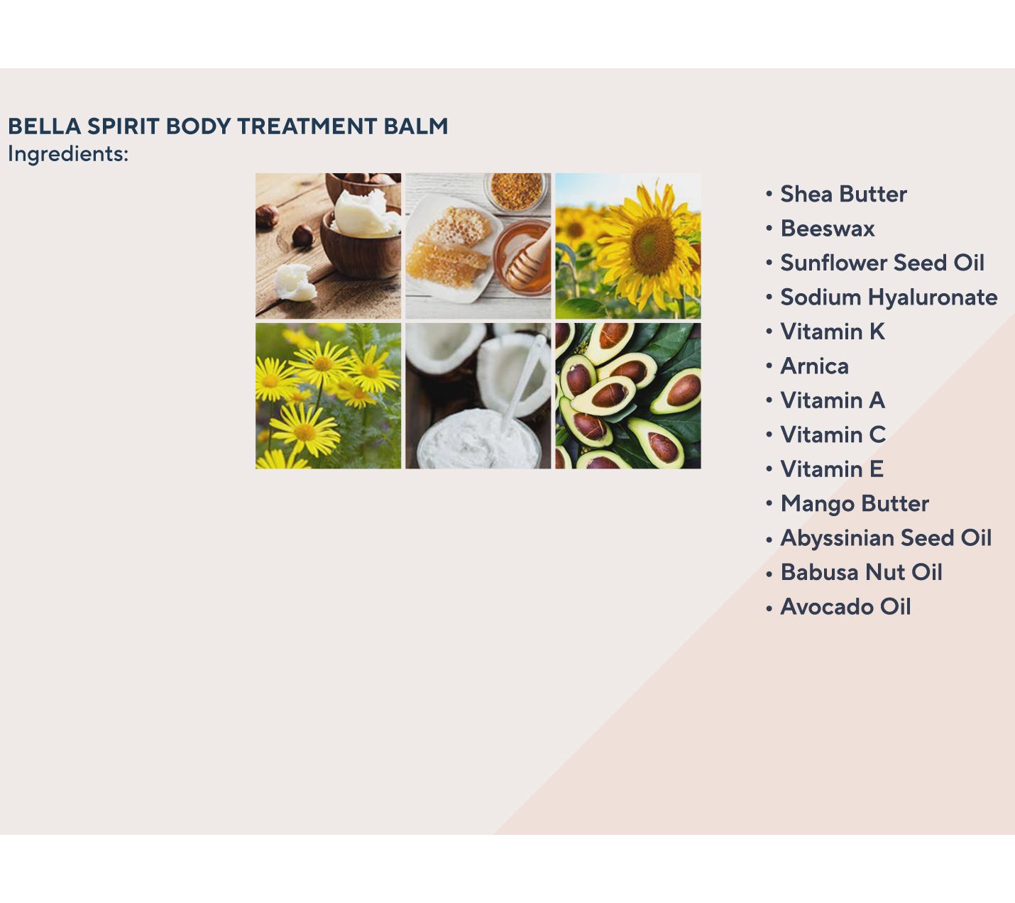 Bella Spirit Body Treatment Balm helps your skin stay moisturized from face-to-toe and targets those areas extra-dry areas. Made with shea butter, beeswax, botanicals, vitamins, minerals, and sodium hyaluronate, it locks in moisture to address dry skin. The soft-balm texture melts with your skin's warmth. Simply massage this nourishing balm wherever your skin needs extra care. This hydrating formula helps improve smooth the look of fine lines and wrinkles plus it helps plump up the look of skin wherever you apply.