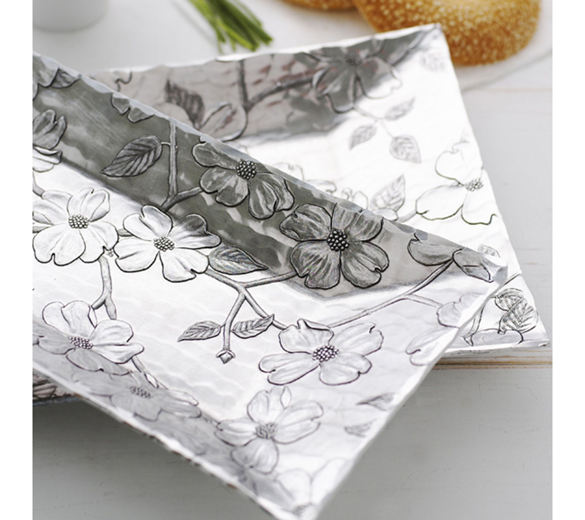 Serve up memorable moments with the Dogwood Design Small Horizon Server, where modern elegance meets cherished tradition. Its high-shine aluminum finish and classic floral motif create a stunning backdrop for everything from warm bread to dramatic centerpieces -- bringing both beauty and ease to casual gatherings and special occasions alike. From Wendell August.