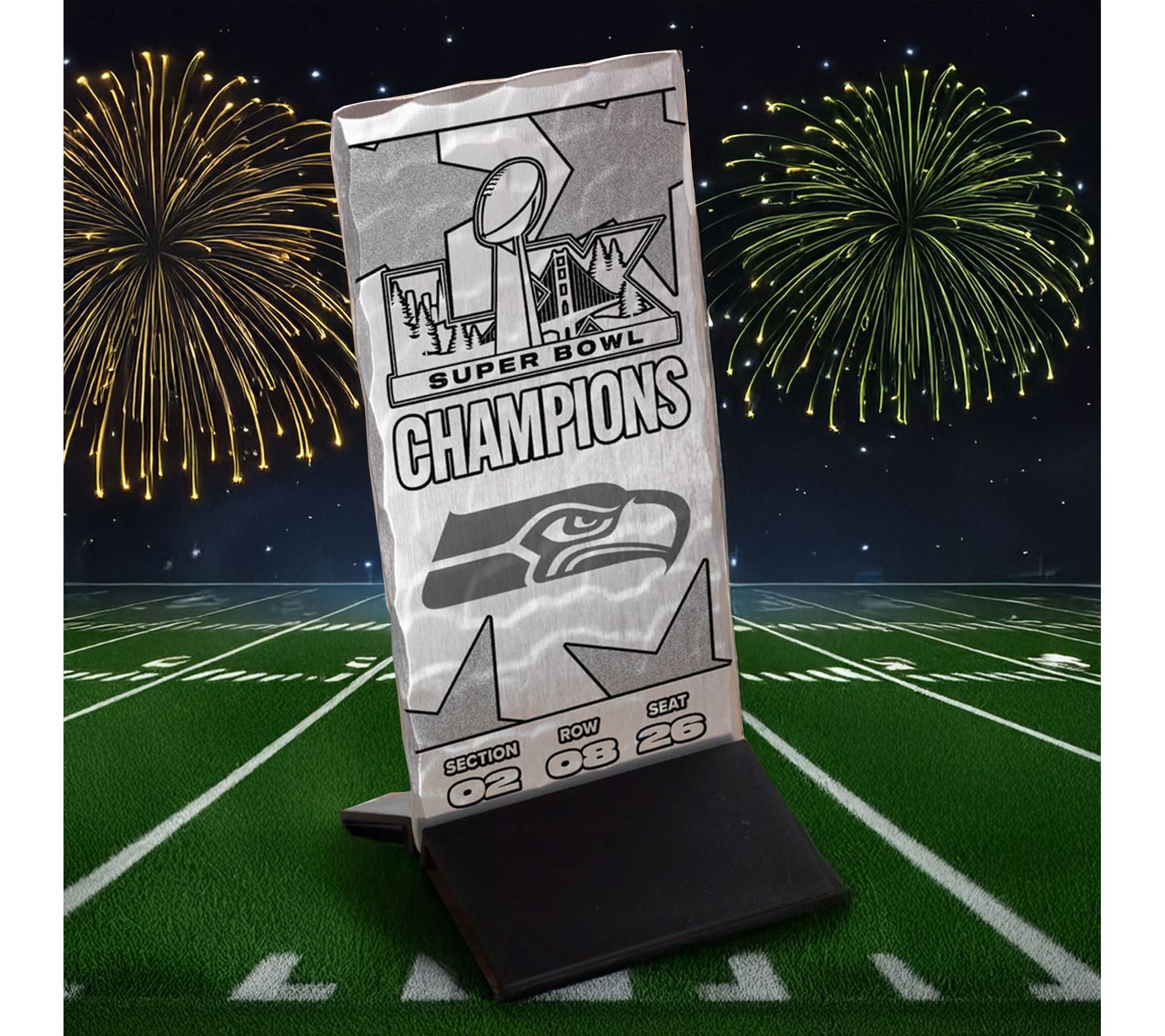Relive the glory of an unforgettable football season with this decorative championship ticket -- a must-have display piece for Seattle Seahawks fans. Shaped like a real game-day keepsake, this aluminum accent celebrates Super Bowl LX victory and brings team pride to your home or office. From Wendell August.