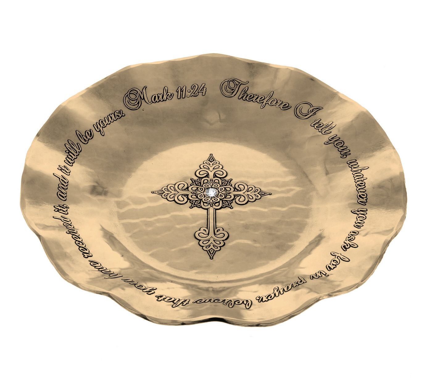 This beautifully crafted bronze bowl serves as a gentle reminder of the power of prayer in everyday life. Adorned with a detailed cross and a radiant crystal at its center, its hand-hammered design is both eye-catching and inspirational. Inscribed with Mark 11:24, it prompts meaningful reflection with every glance. Use the included prayer cards to express your daily intentions, making this bowl a thoughtful addition to your personal devo routines or a treasured gift for loved ones. From Wendell August.