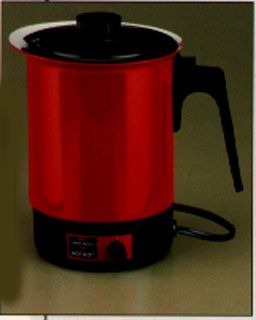 This is a 6-cup electric kettle that warms soups and milk or boils water quickly for instant beverages. It features an adjustable heat control knob, a lock-on cover that helps minimize accidental spills, and interior water level marks for easy filling. The heat-resistant handle, cover and base nicely compliment the contemporary red finish. 600 watts. UL listed.