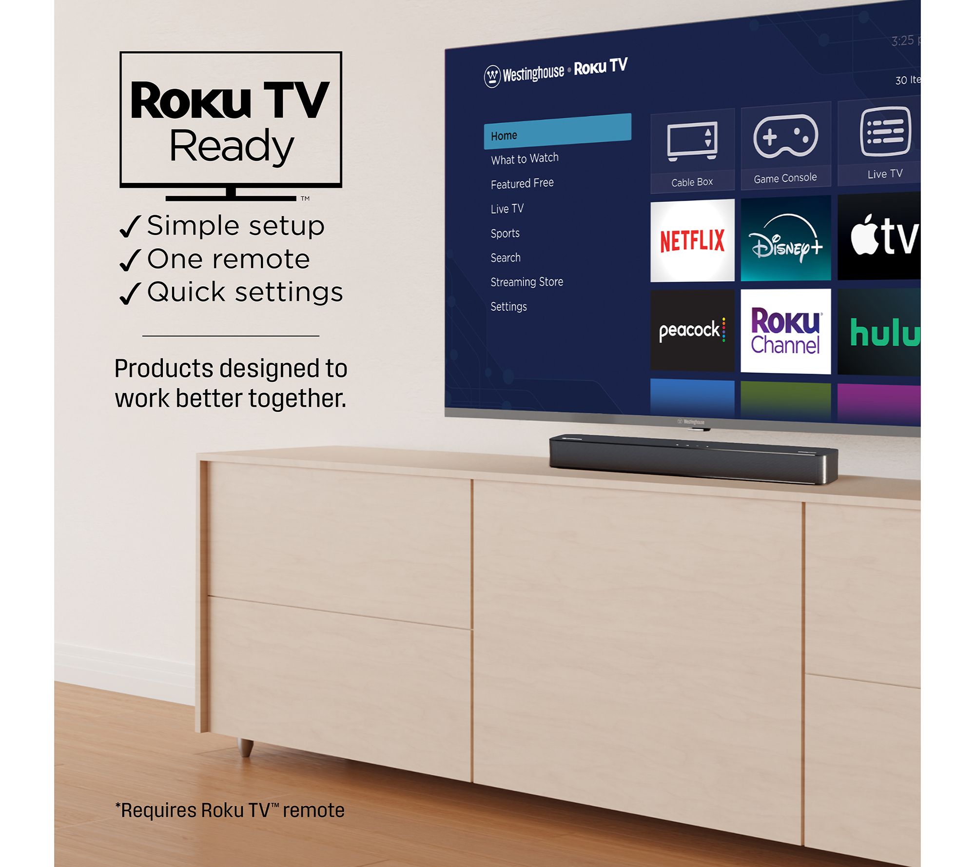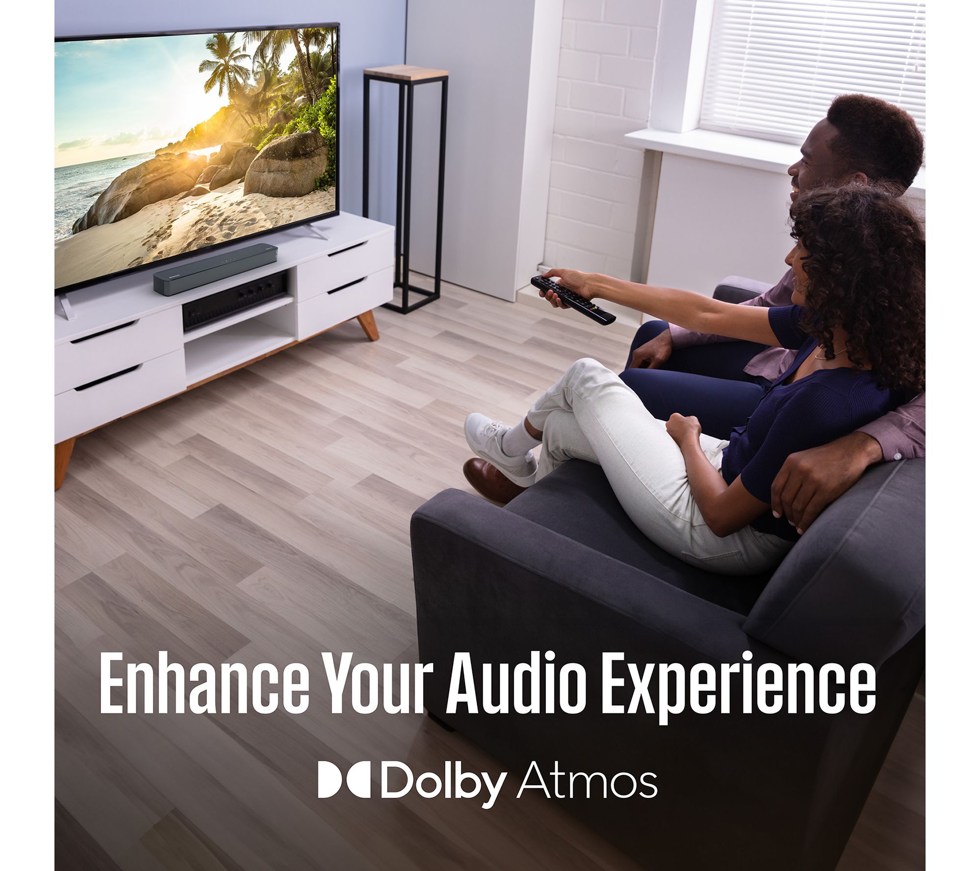 The Westinghouse 2.0 Mini 120-Watt Sound Bar provides exceptional audio quality, enhancing dialogue clarity and creating an immersive listening experience. Integrated with Dolby Atmos and Dolby Digital Plus, it ensures better sound direction and depth for all your entertainment needs. Seamlessly compatible with Roku TV, it offers easy setup and sound control with any Roku remote. From Westinghouse.