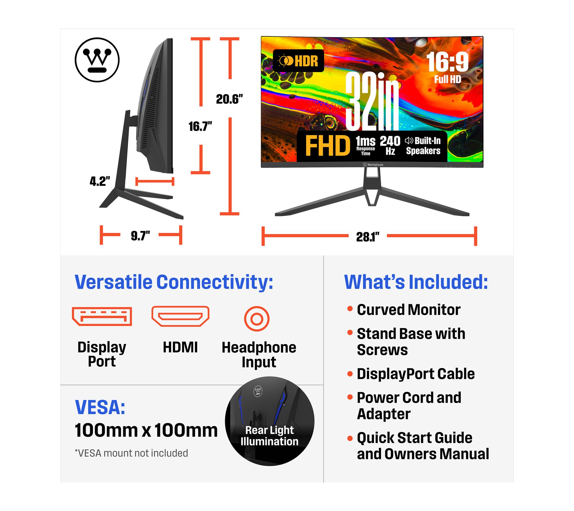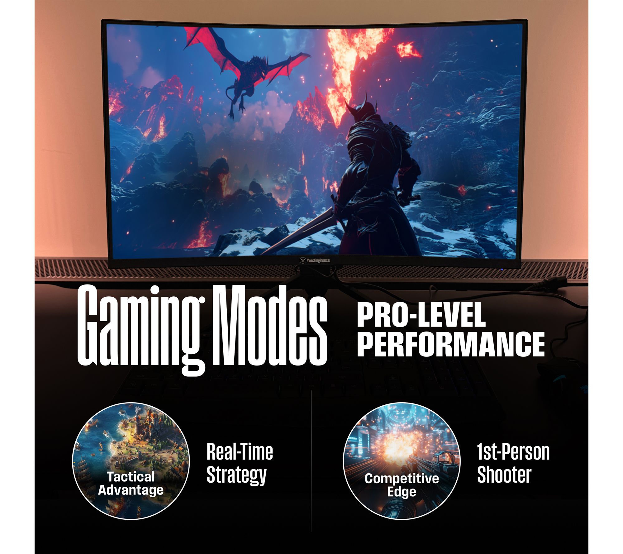 Elevate every gaming session with a curved Full HD monitor that draws you into the action, making each scene pop with vivid color and stunning detail. Whether you're racing through new worlds or tackling intense battles, enjoy smooth gameplay with a rapid refresh rate and immersive visuals that keep you ahead of the competition. From Westinghouse.