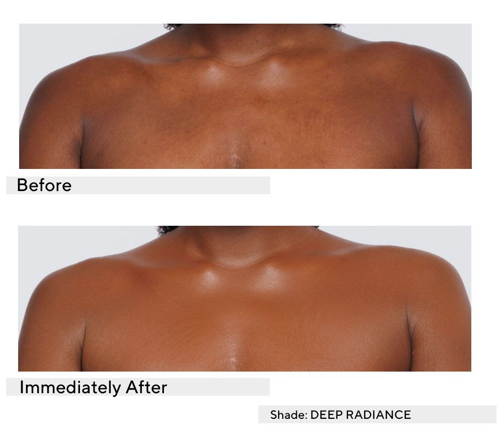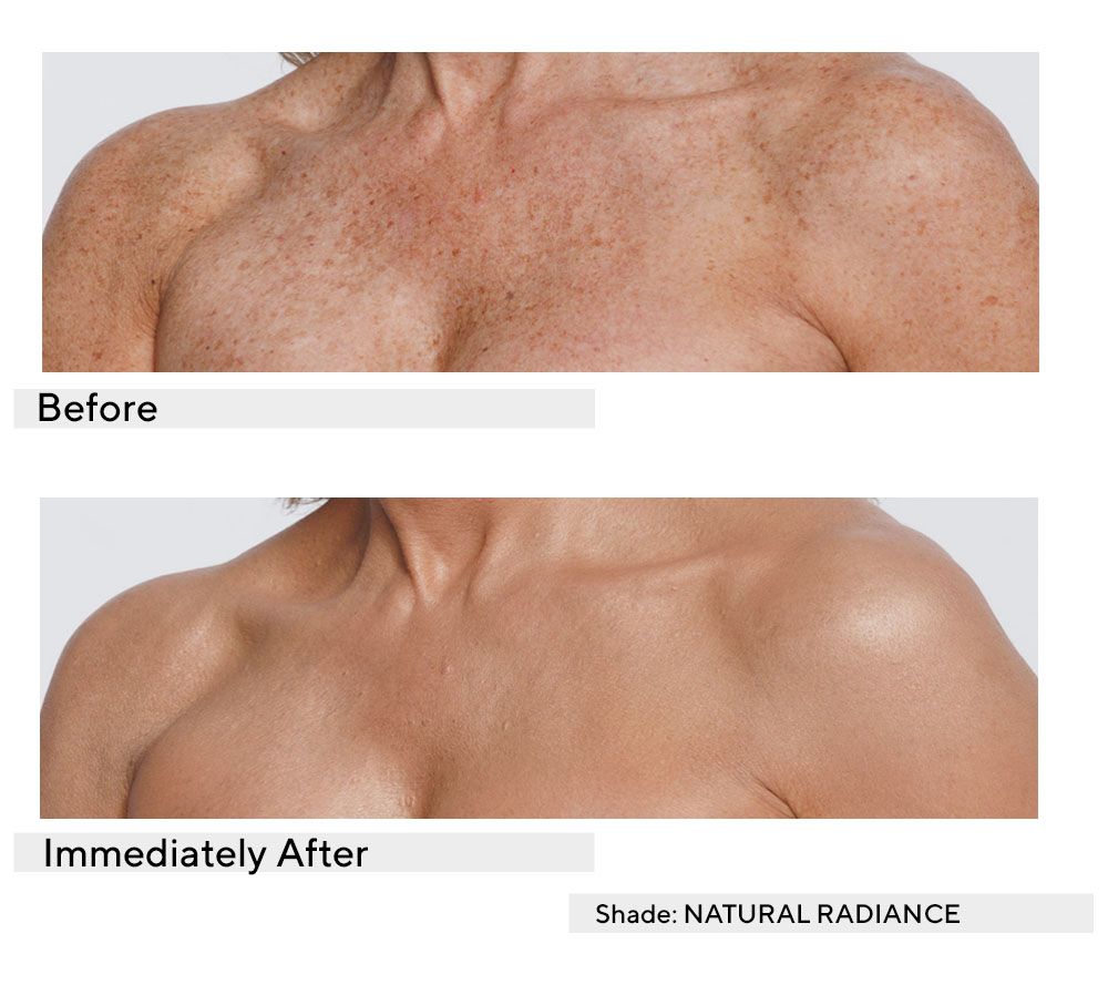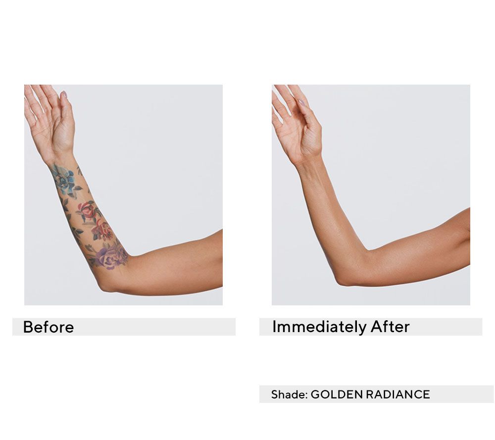 How do I use it: Start with clean, dry, and oil-free skin. If applying lotion, make sure it is oil-free. Apply liberally onto the area you'd like to perfect; using hands or brush, blend in an upward and outward motion. Allow the product to dry for 10 minutes, and if needed, apply additional layers for more coverage, allowing each to dry for 10 minutes. Remove excess product by buffing the coverage area with a tissue, towel, or mitt until product no longer comes off. Allow 10 minutes for the product to fully set before coming in contact with clothing or bed sheets.