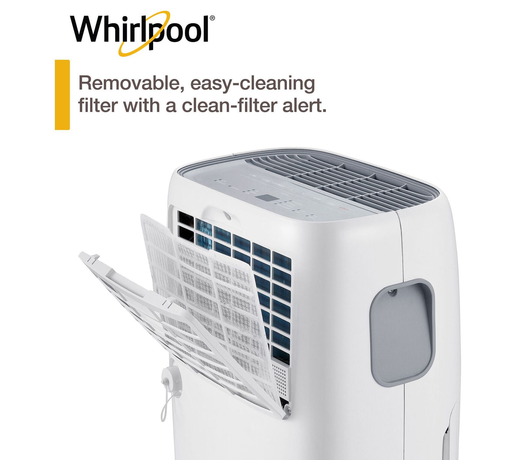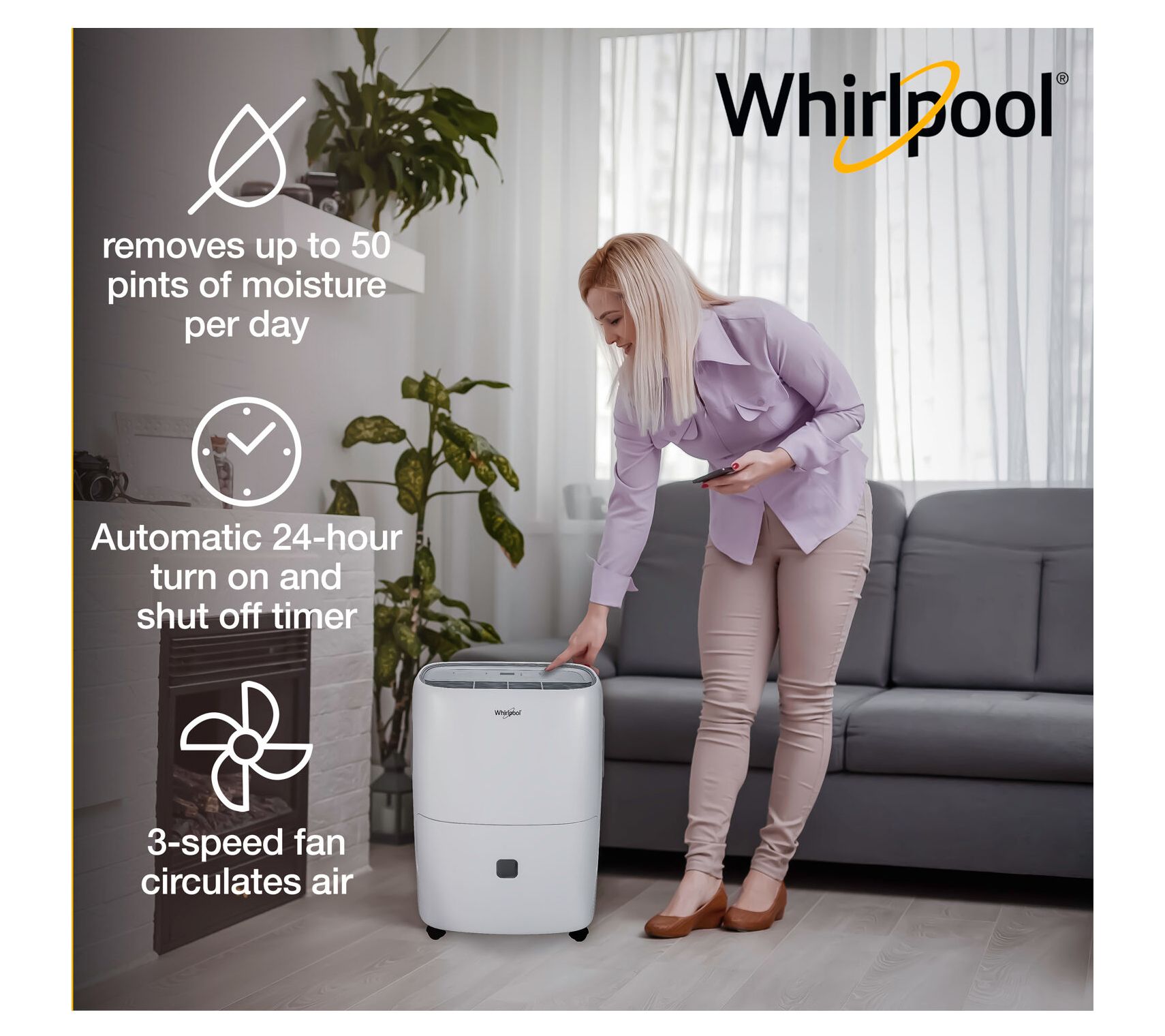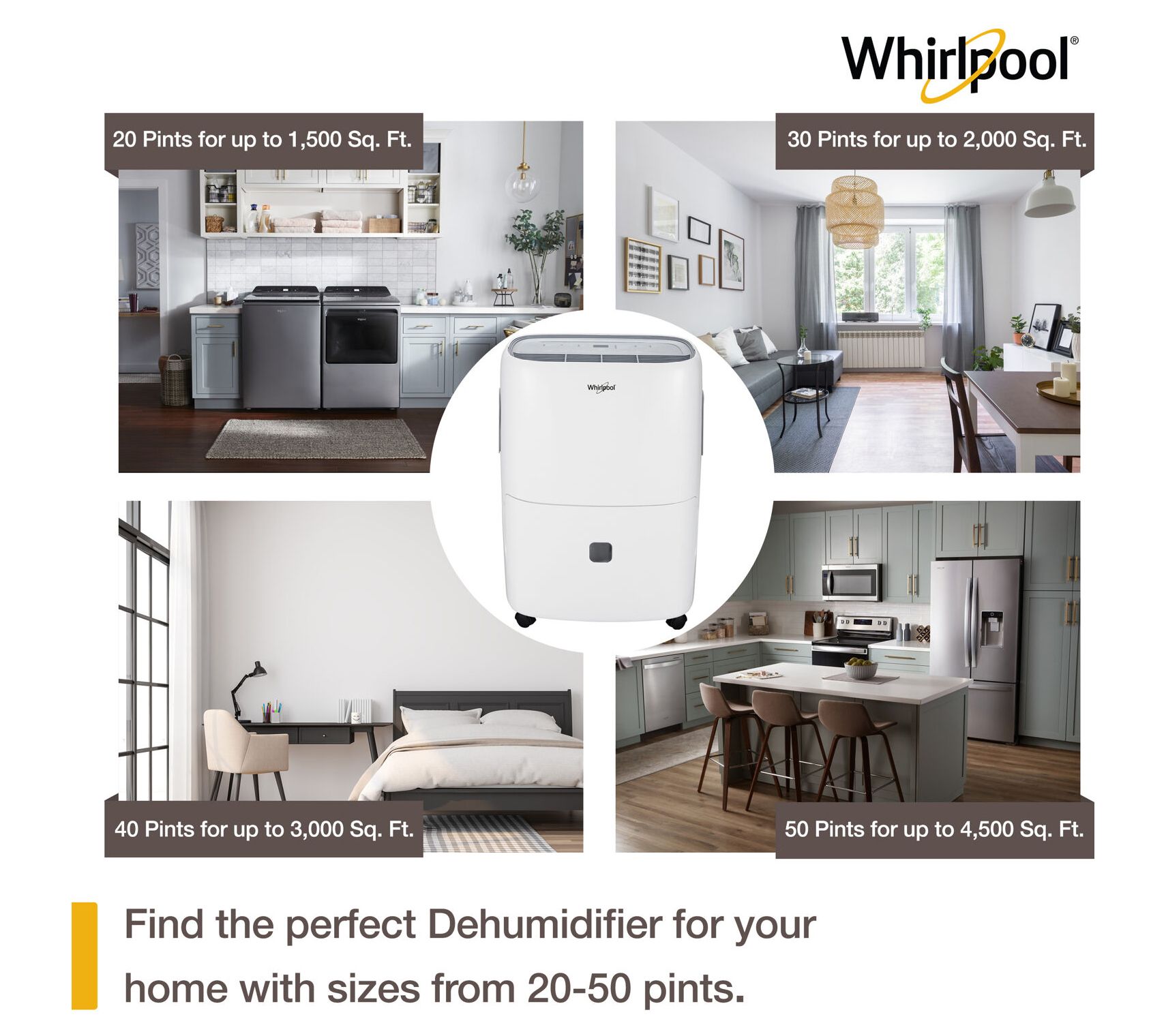 Breathe easy and kick up your feet in comfort, knowing this portable dehumidifier removes up to 50 pints of moisture per day in a room up to 650 square feet. From Whirlpool.