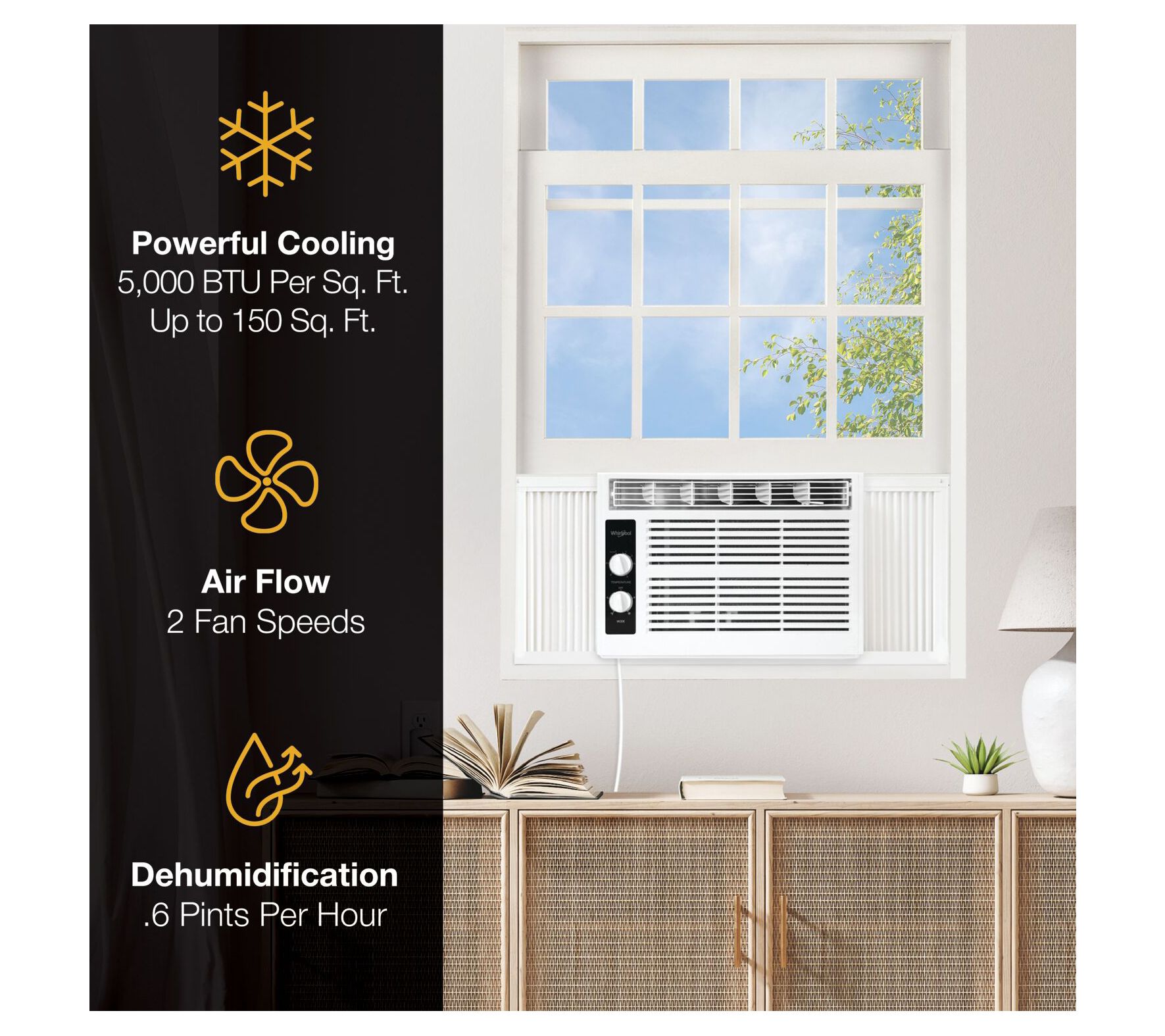 Keep your favorite room comfortably cool with the Whirlpool window air conditioner. Easy-to-use mechanical rotary controls and two cooling speeds let you customize the chill just how you like it, while the 8-way air directional flow means cool air reaches every corner. Auto restart takes care of the hard work so you stay refreshed, even after a power outage. From Whirlpool.