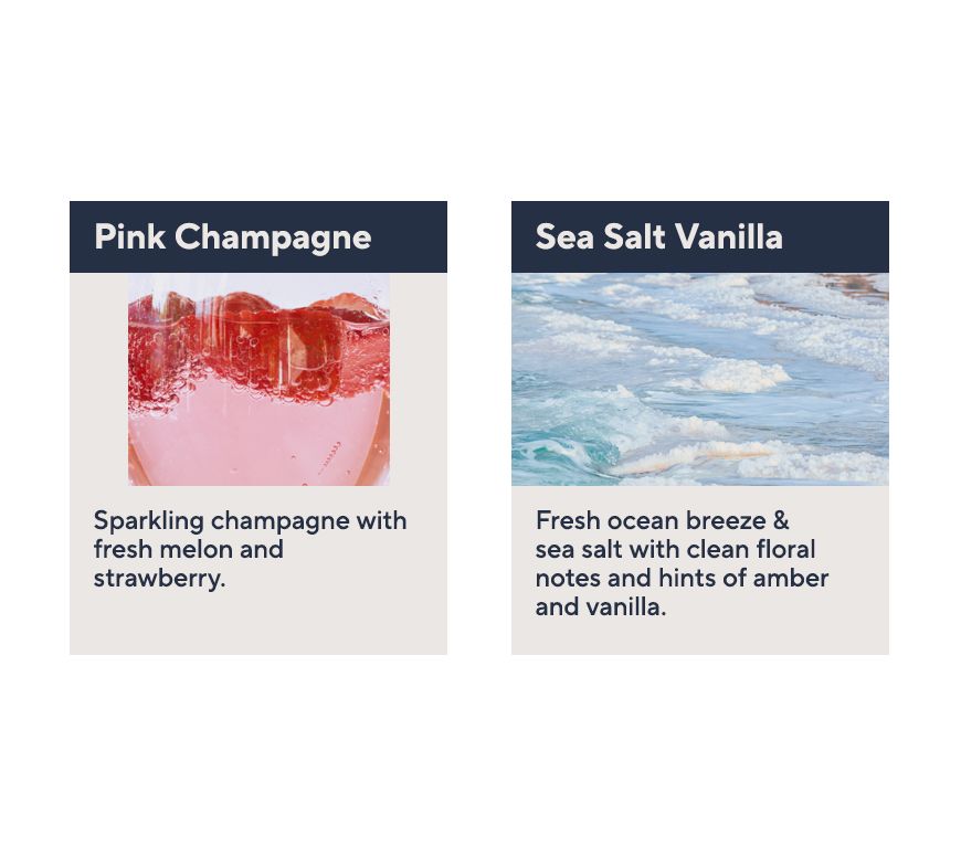 Sea Salt Vanilla: fresh ocean breeze and sea salt, clean floral notes, and hints of amber and vanilla