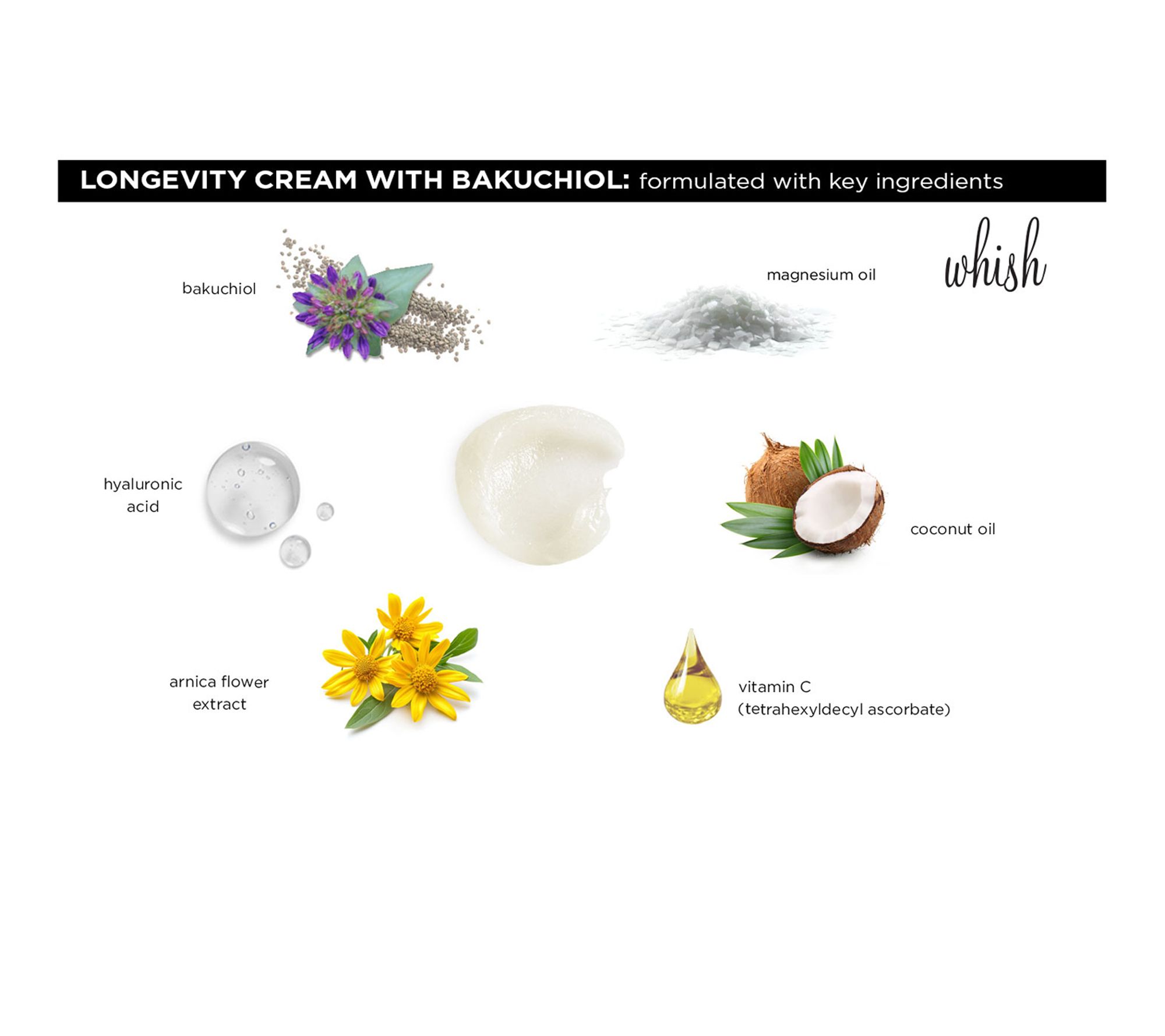 This Longevity Cream nourishes the skin with moisture and leaves skin feeling smooth and revived. It contains Bakuchiol which is an alternative to retinol and is known to improve the look of fine lines and wrinkles.