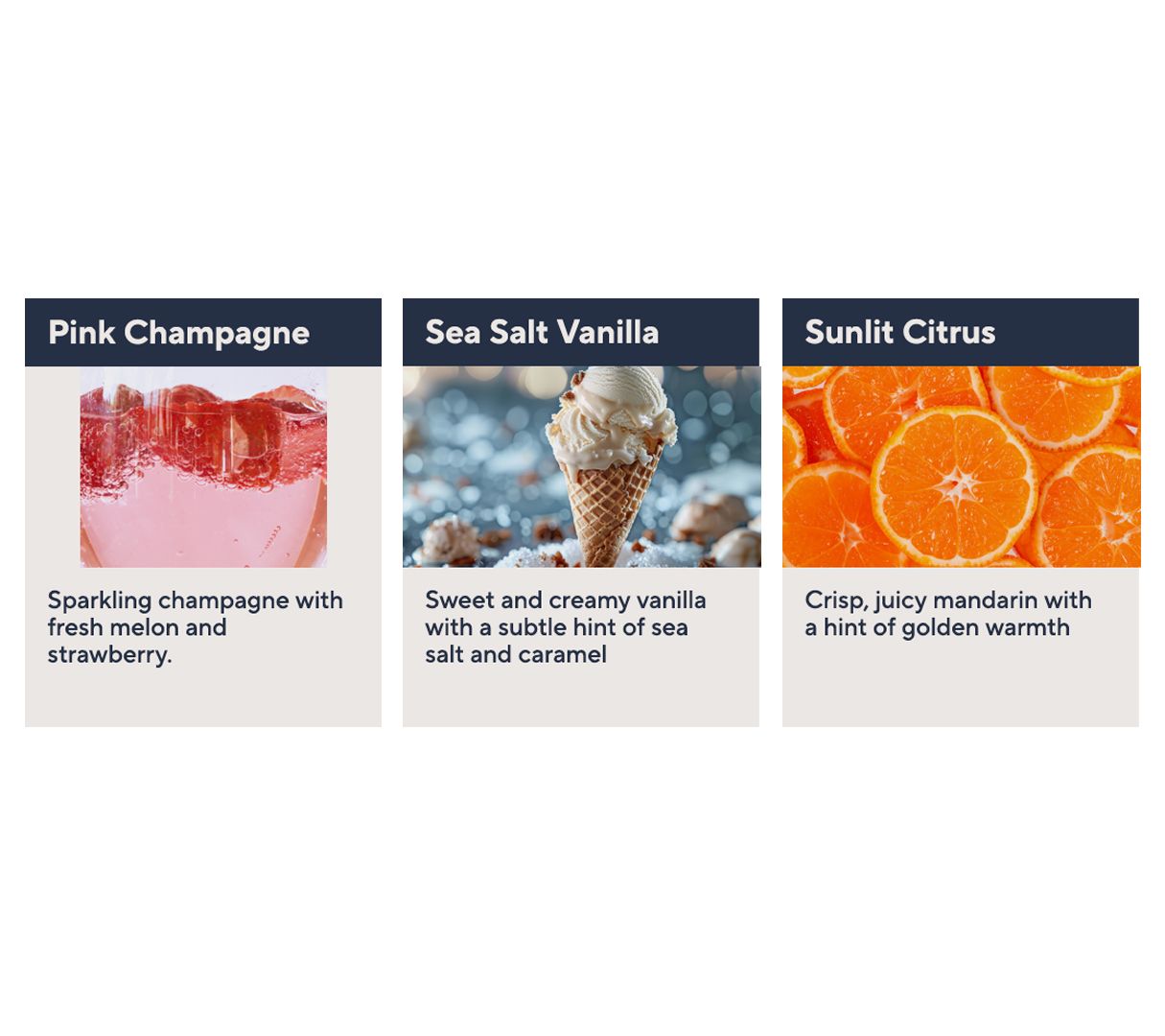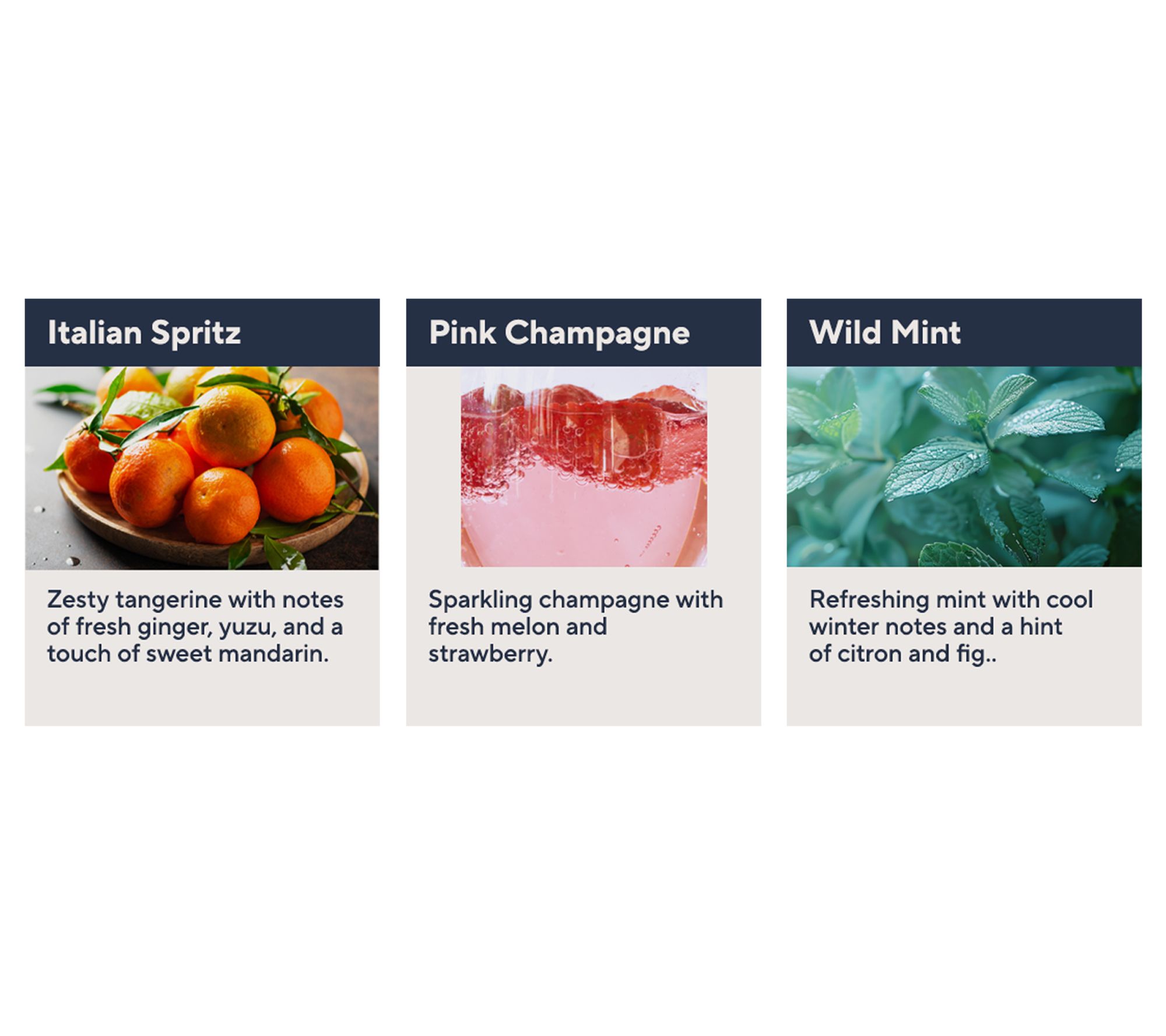 - Wild Mint: Refreshing mint with cool winter notes and a hint of citron and fig
