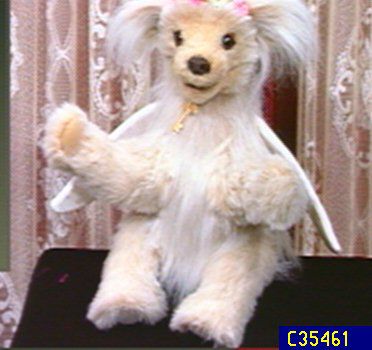 The specially designed armature enables this bear to be posed in a variety of positions including sitting, hugging, or standing on all fours. She has a moveable head, legs and is made of soft light cream acrylic plush, with a hand shaved muzzle and a leather nose. Her eyes are plastic and she wears a gold tone key around her neck. She also wears a flowered halo on her head and she has gold and white wings. Limited to 250. Individually signed and numbered on foot. Comes with a hang tag. Measures 20". Made in USA.