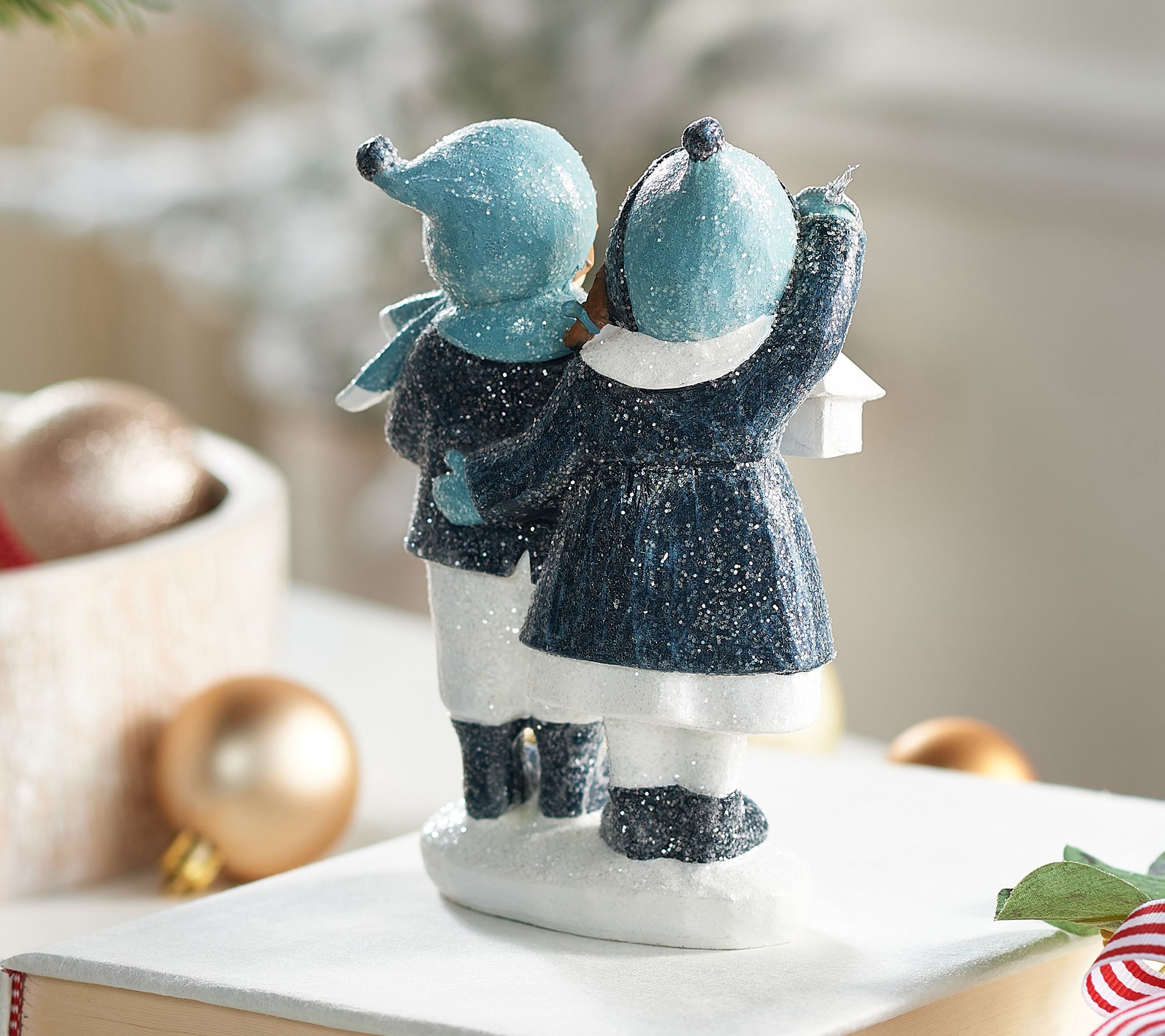 Dressed in winter attire and coated in glitter for a shimmering effect, this sweet little girl and boy have come to spread holiday joy. From the Valerie Parr Hill Collection.