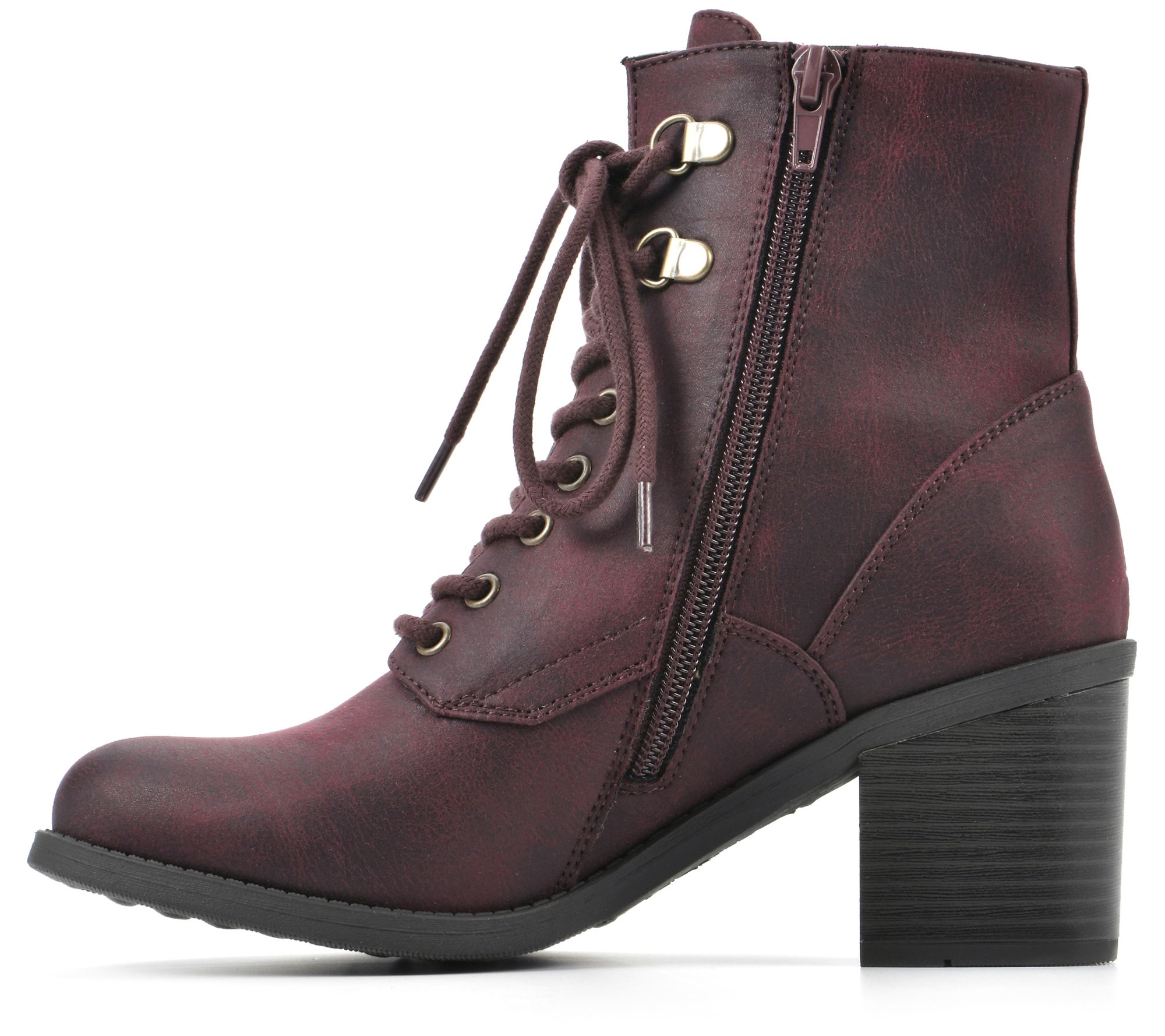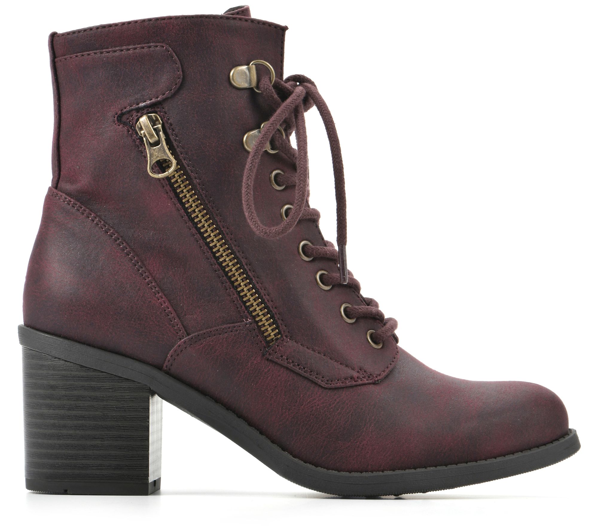 Lace-up and side zip closure, decorative zipper embellishments, rounded toe