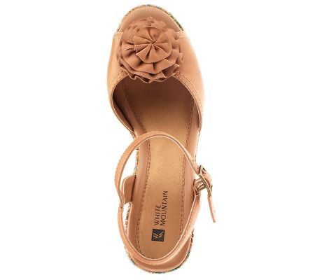 Sweet treat--for your feet! A beautiful flower blooms atop the toe of these leather wedge sandals, sure to add some sugar to your warm-weather wear. A woven chevron pattern on the heel is the icing on the cake. From White Mountain.