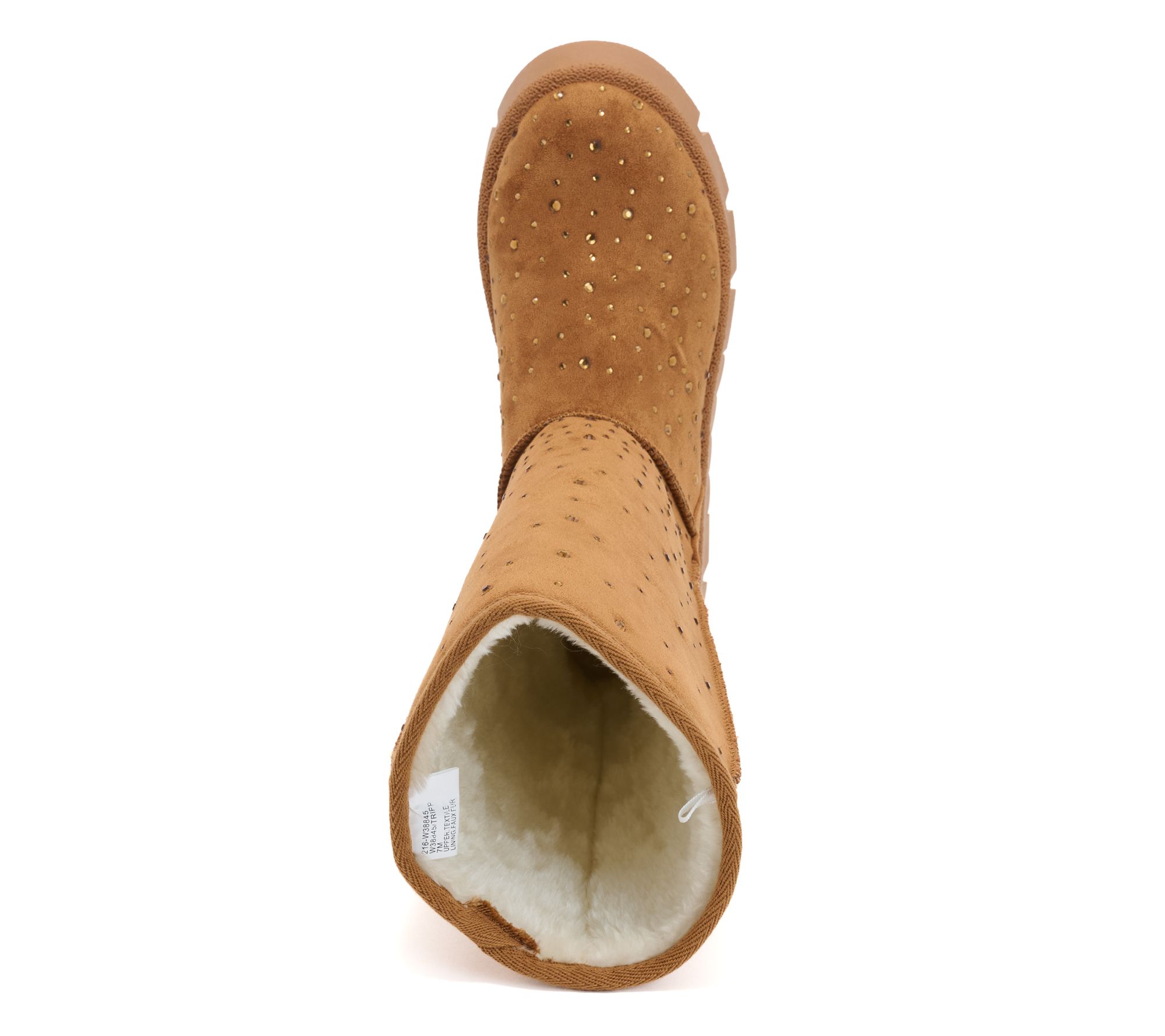 Pull-on style, water-repellent, suedette upper with glitter stone accents